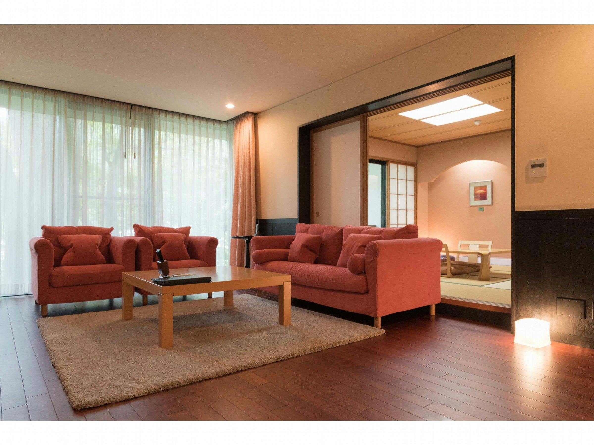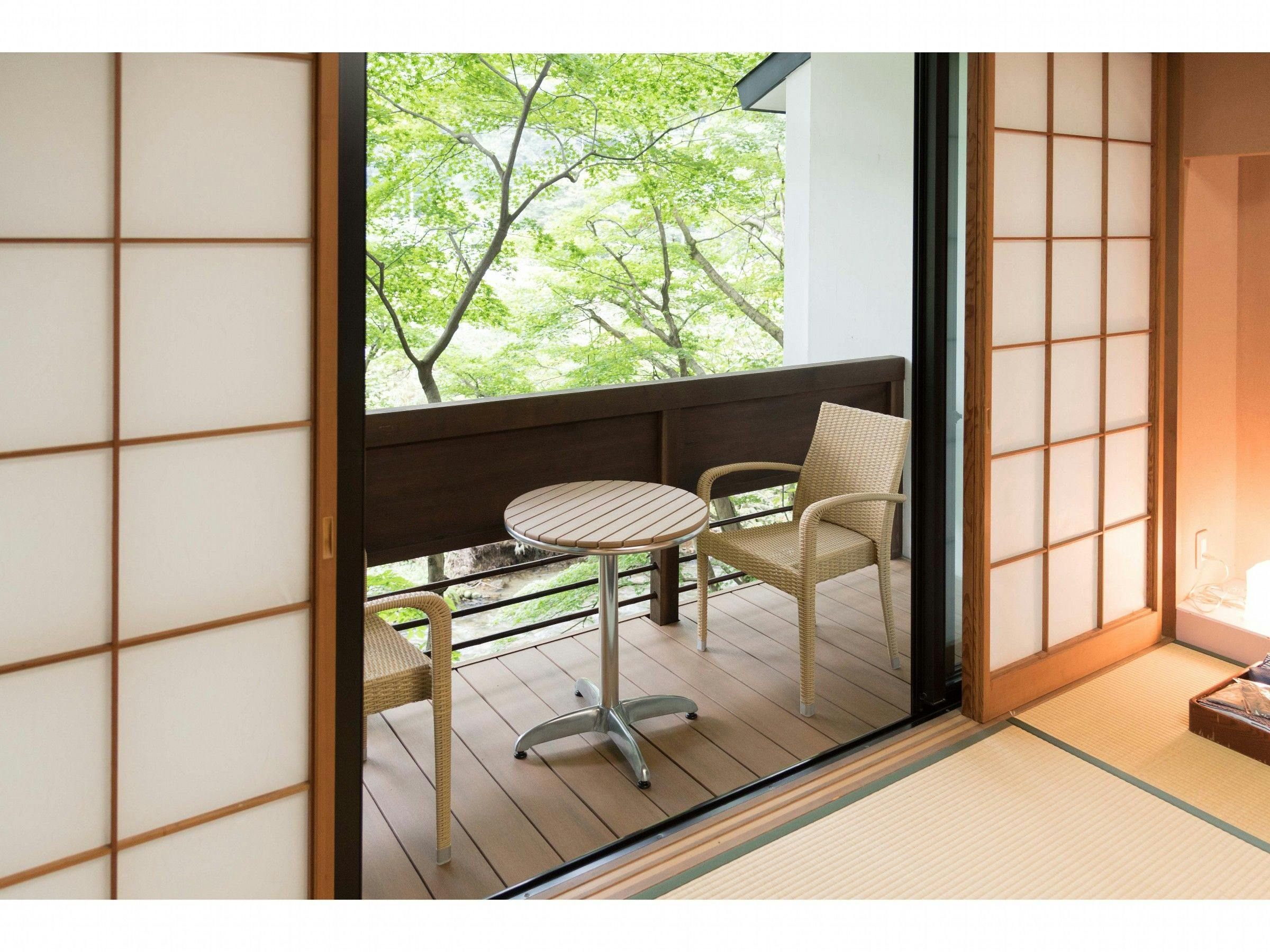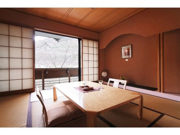 7つの離れで過ごす寛ぎの時間■禁煙室2017年9月完成。リビングとテラスをリニューアル。床暖完備でモダンな木の温もりが素足で感じられます。テーマは「はなやぎ」。昔から恋心や愛情を表現する色とされる薄紅色を基調に、春のようなやさしい温もりを部屋の中に表現しました。和室を開けると見える五百川の流れと濡れ縁が、季節の風景を演出してくれます。こちらのお部屋は2階建てになります。