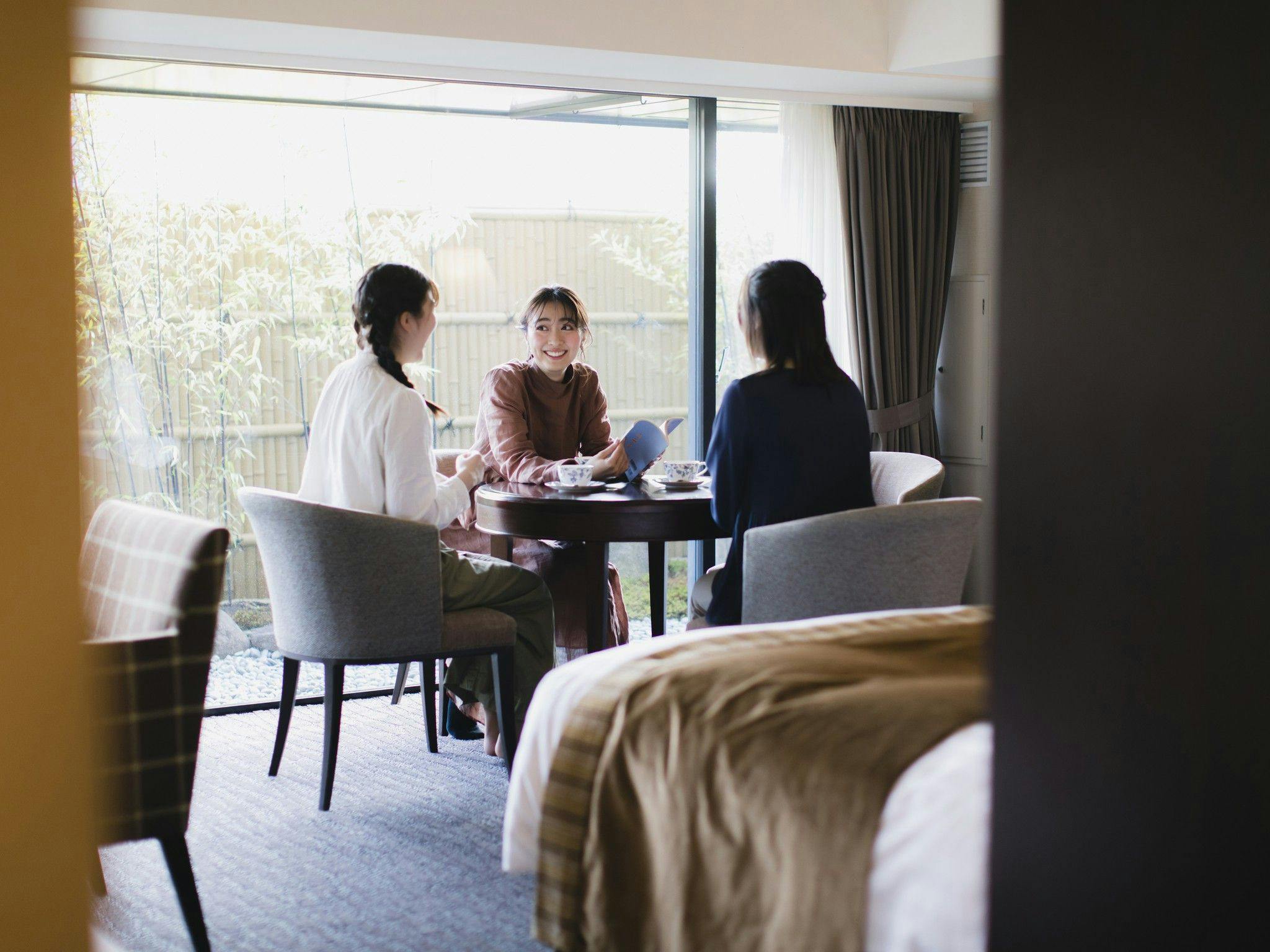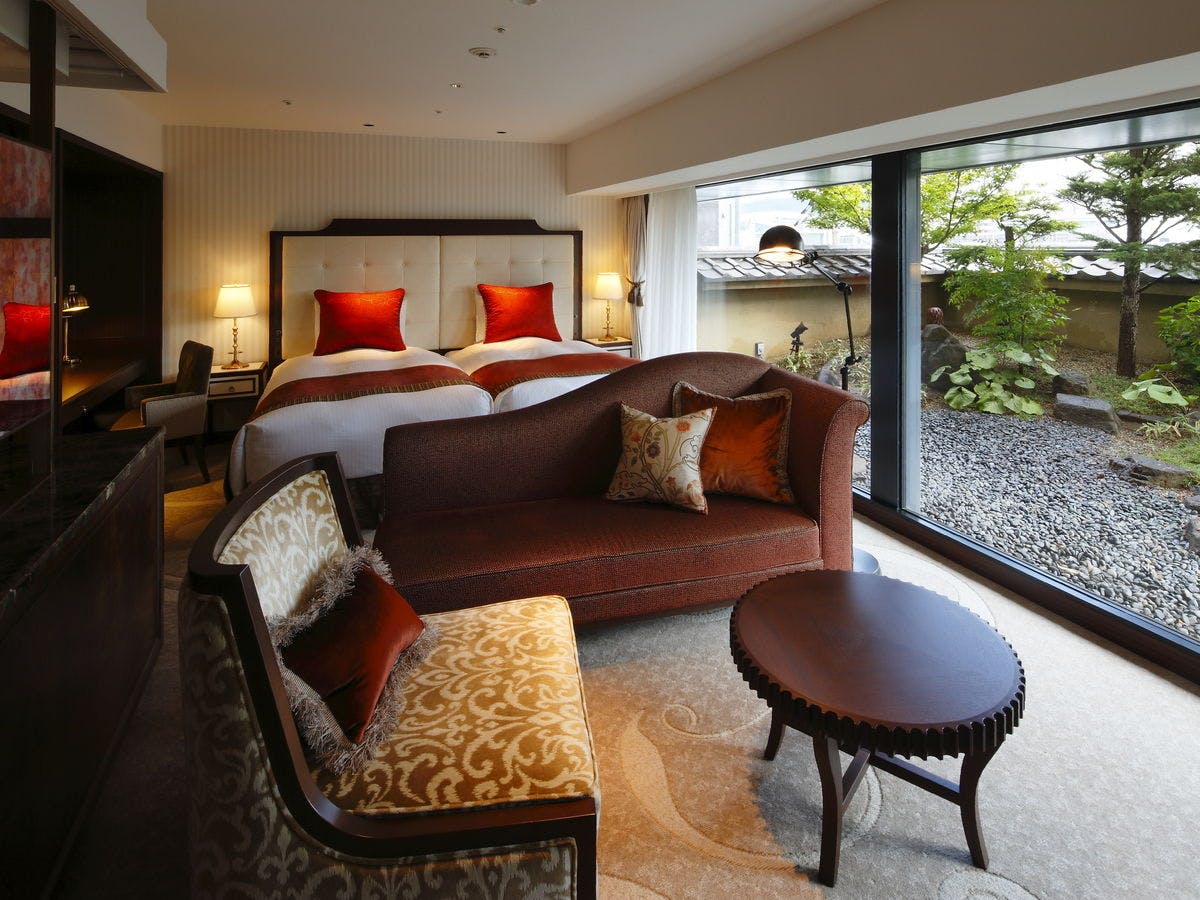情緒ある庭に面したガーデンスイートルームは、79平米の広々としたお部屋に米国生まれシモンズ社の最高レベルのマットレスをご用意。また、お二人で並んでご利用いただけるダブルアウトベーシン、ダイニングには京都をイメージして作られたアートを配するなど、ゆったりとお過ごしいただける空間です。