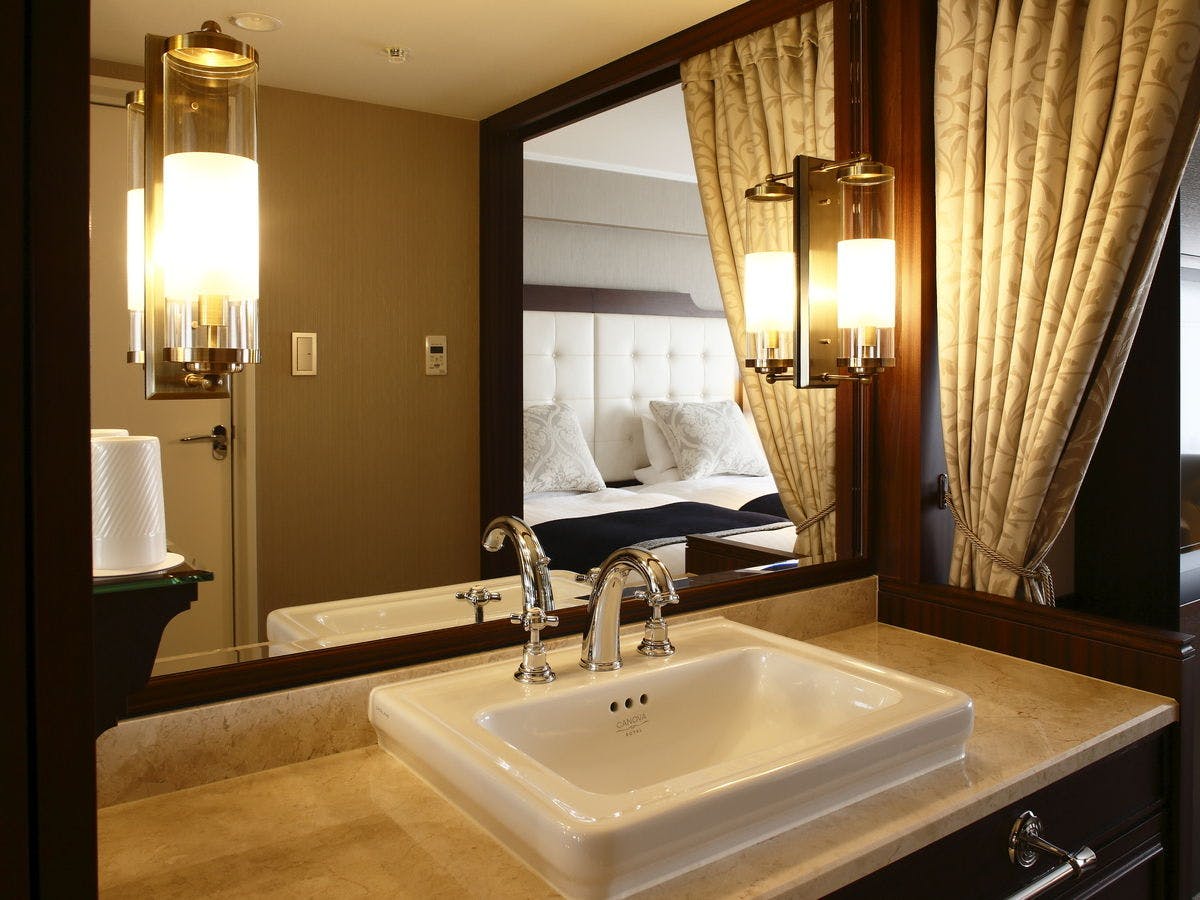 ノスタルジックモダンをテーマとしたお部屋は、坪庭に面し自然を感じる安らぎの空間です。お庭向きのダブルベーシンを利用すれば開放感ある時間に。ゆったりとおくつろぎいただけるよう、バスタブは独立型に。米国生まれのシモンズ社製の世界トップレベルのマットレスと羽毛のデュベで究極の眠りを目指します。
