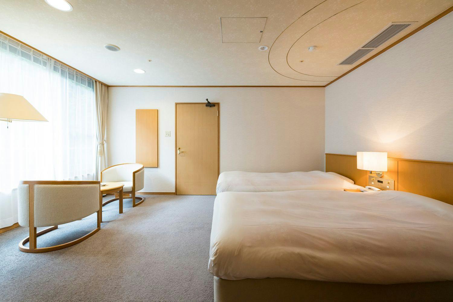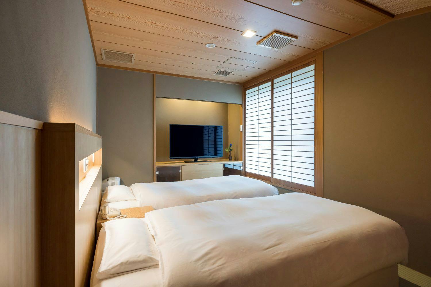 西館6階に位置し、和の趣のある副室にツインベッドを配したお部屋です。木材は国産天然無垢材を使用し、壁材は本聚楽壁で仕上げた日本建築の伝統的な本格和室です。