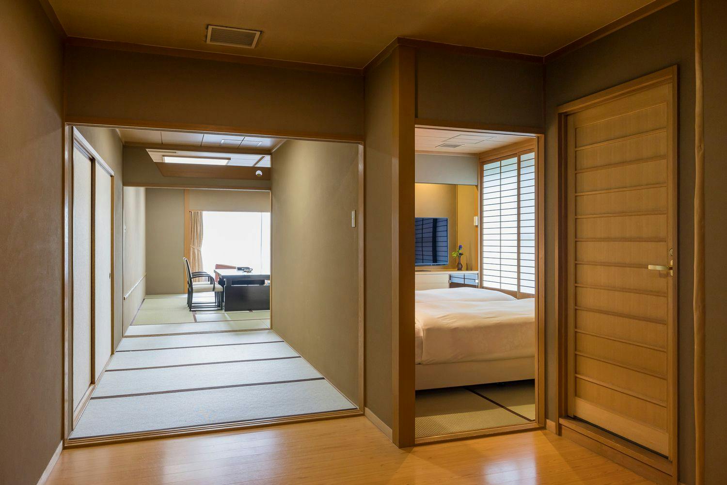 西館6階に位置し、副室(ツインベッド付き)の窓がある解放感あふれるお部屋です。木材は国産天然無垢材を使用し、壁材は本聚楽壁で仕上げた日本建築の伝統的な本格和室です。