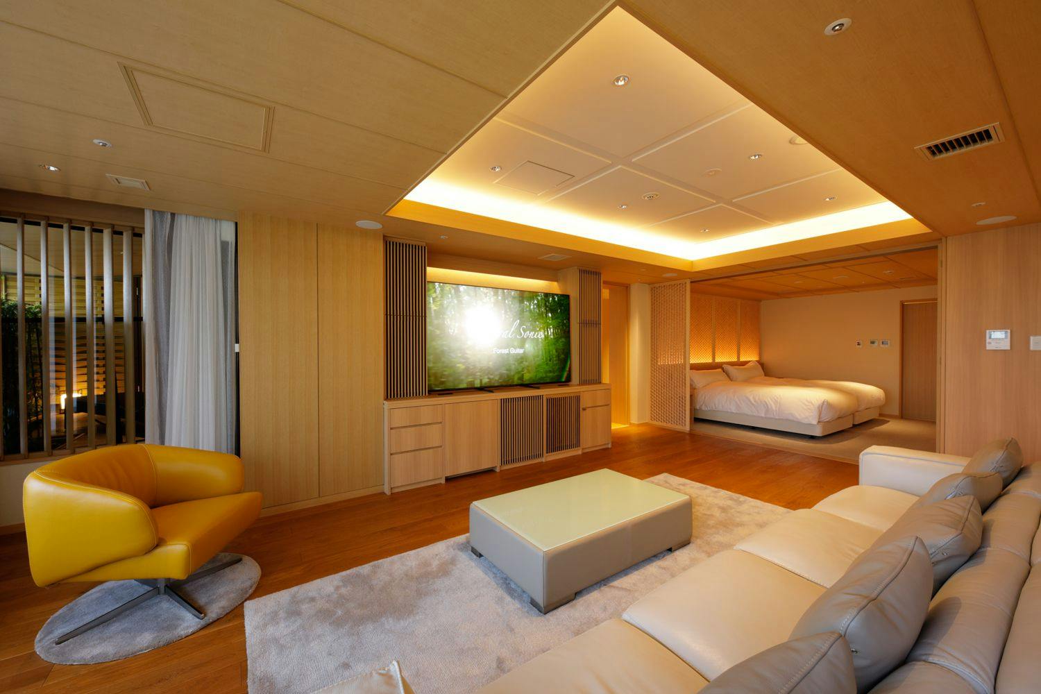 東館角部屋に位置する、銀泉半露天風呂付きの広さ約120平米の特別室。
