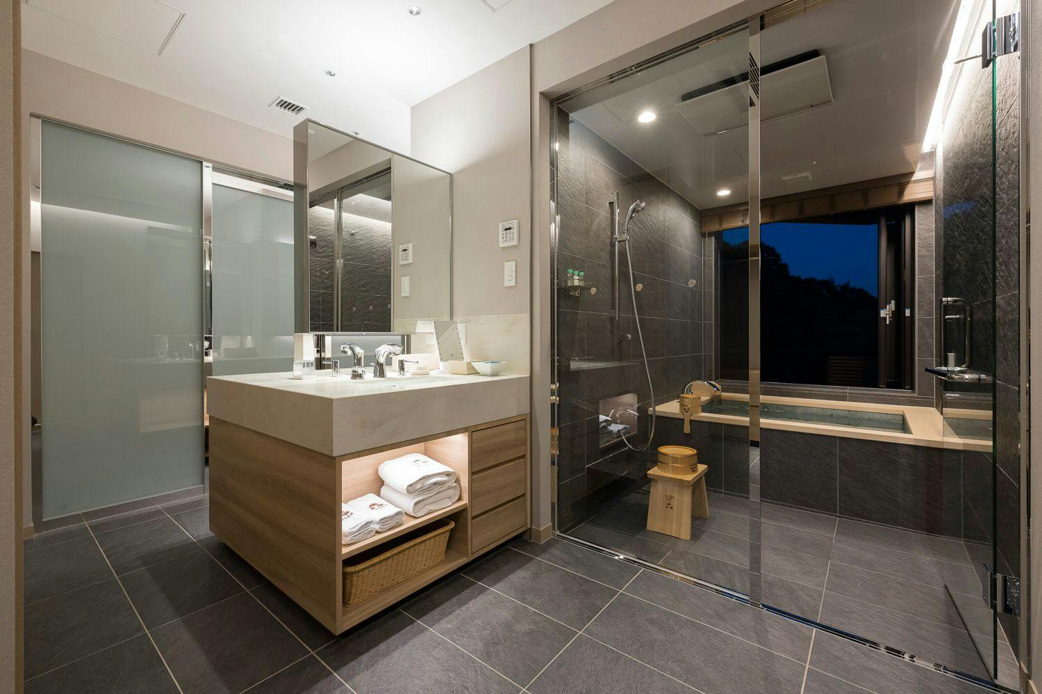 ・月見台付きの客室専有浴室は浴室及び脱衣室に床暖房を施し、開閉式窓ガラスを採用しておりますの