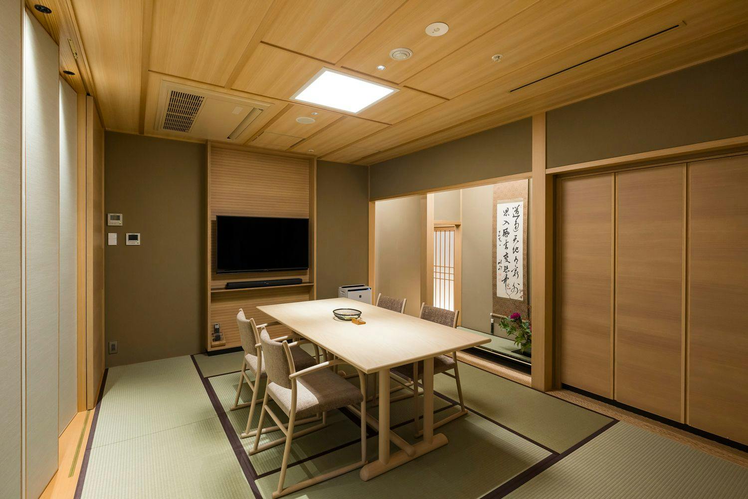 ・お部屋食が可能な8畳和室には、高品質な和風の椅子・テーブルをご用意しています。Bluetooth対応サブウーハー内蔵サウンドバーも設置しております。