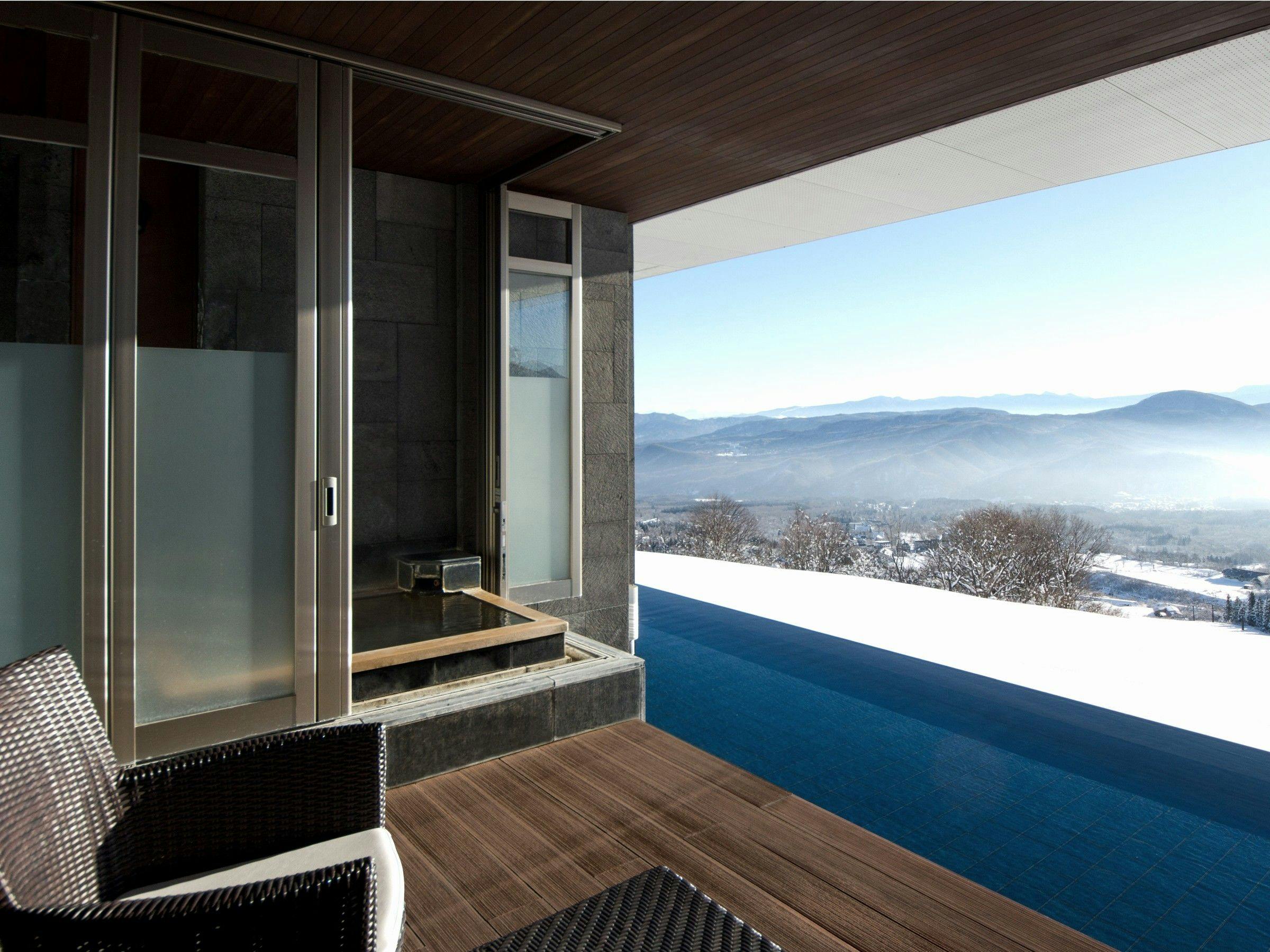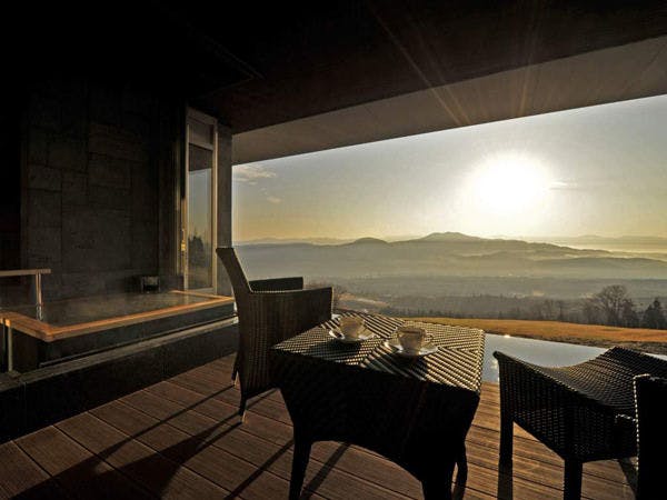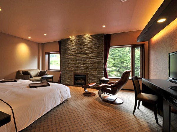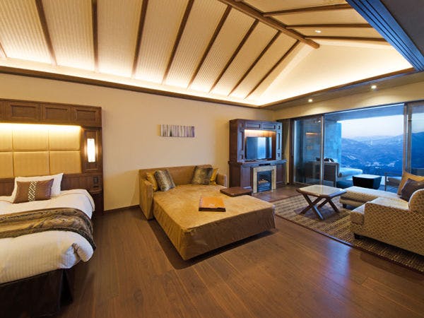 露天風呂のあるデッキテラスからは開放感満点の眺望が広がります。温泉は源泉かけ流しで楽しめます。室内は暖炉(ガス式)とカウチソファーのあるリビングとベッドスペースに別れており、ゆったり滞在することができます。お部屋の広さは、本館客室の約2倍です。