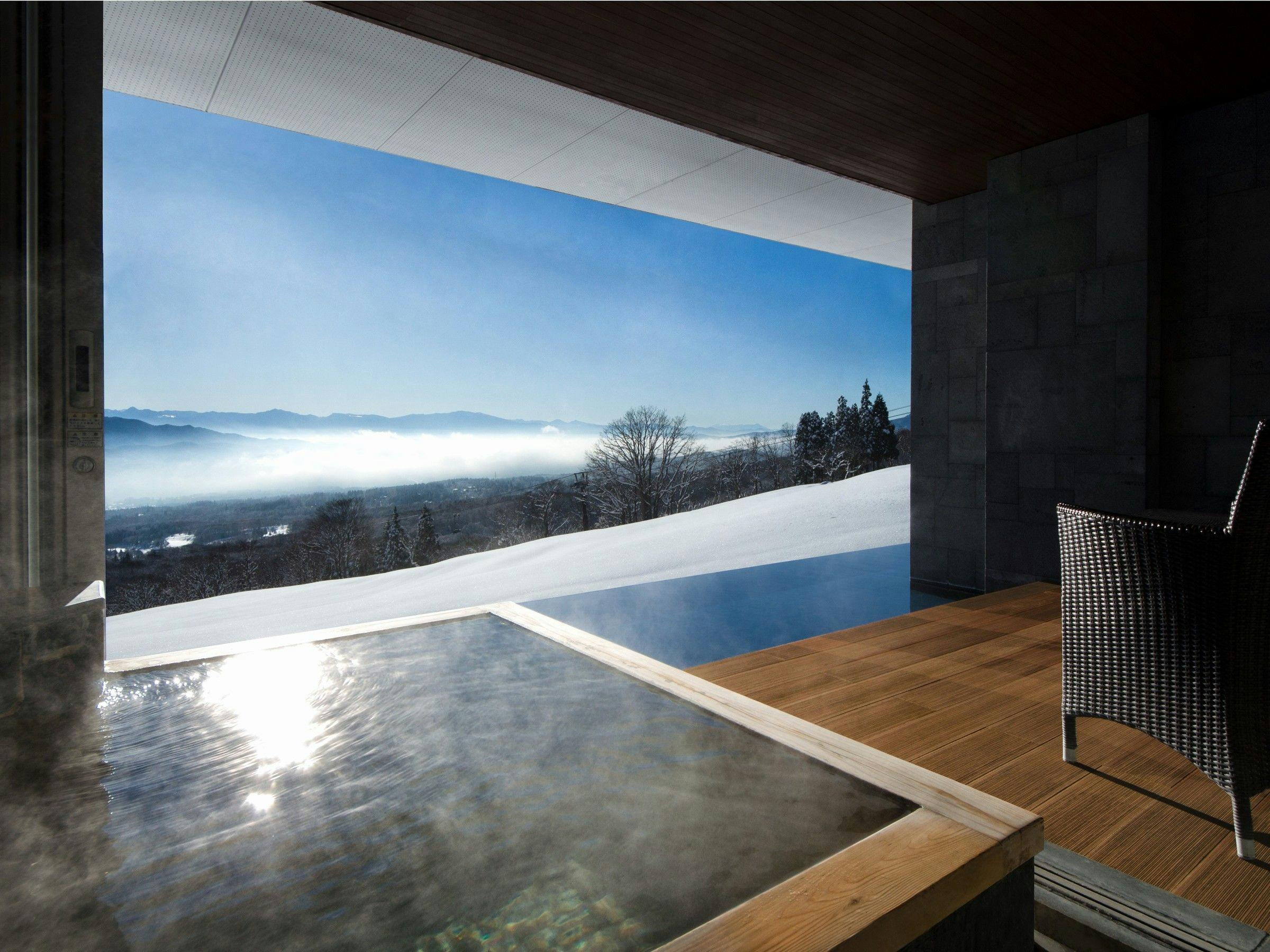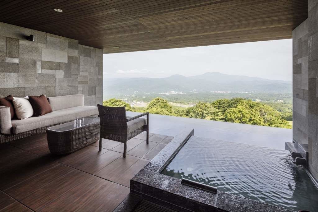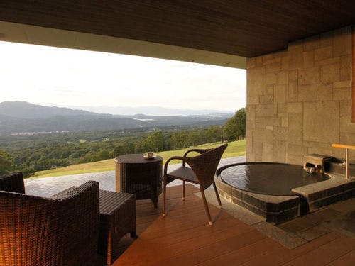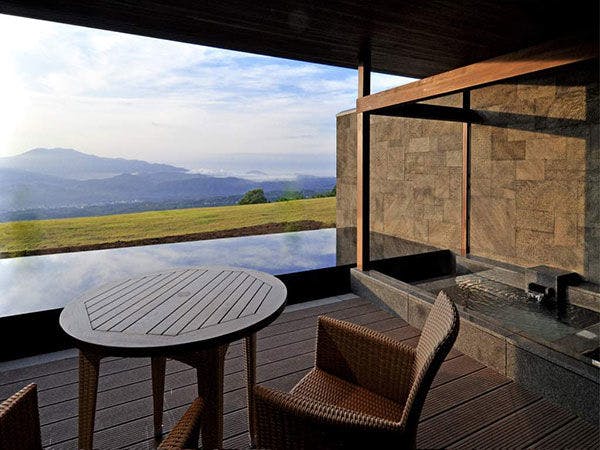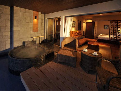 2009年12月「SPA&SUITE棟」にオープンした源泉かけ流しの露天風呂付客室。