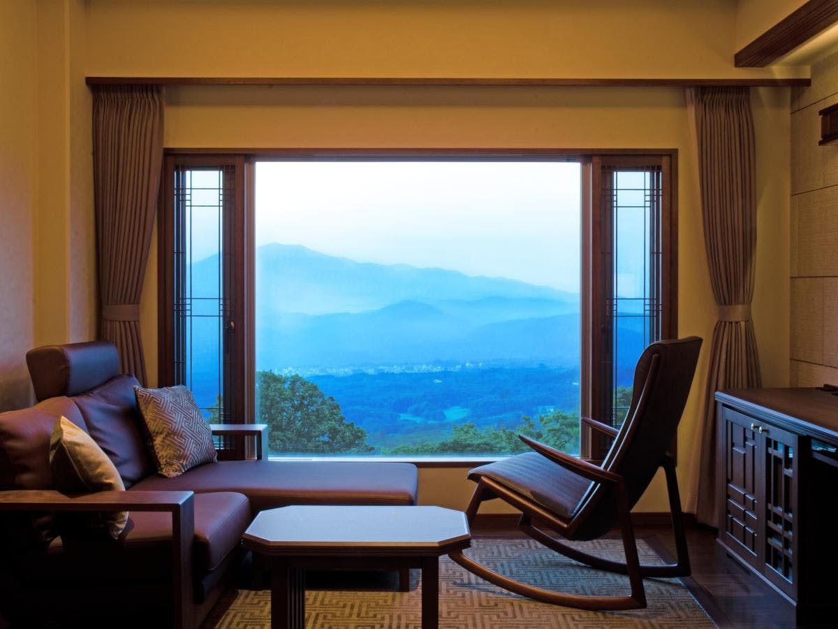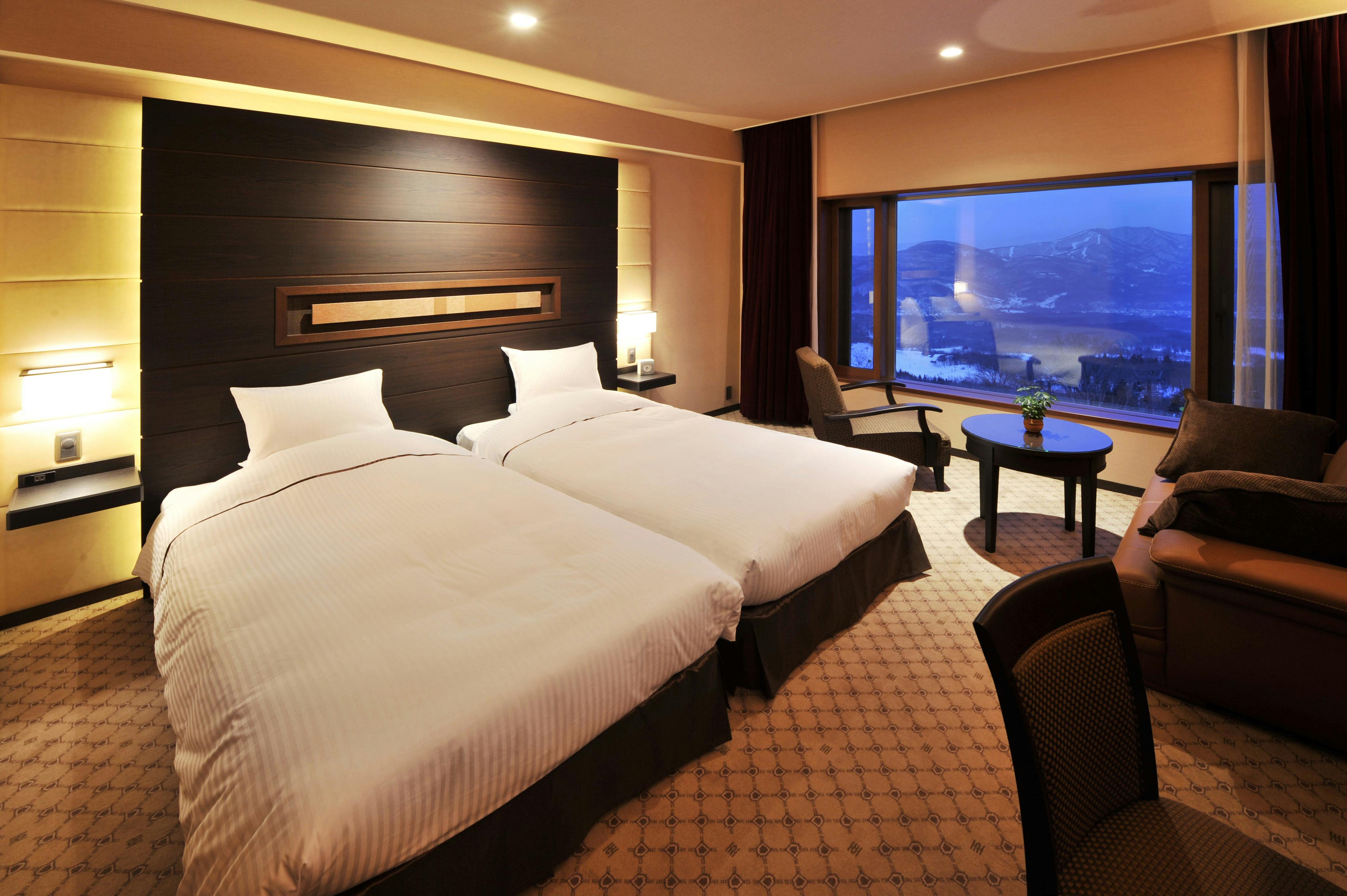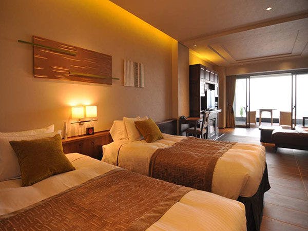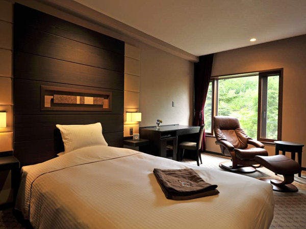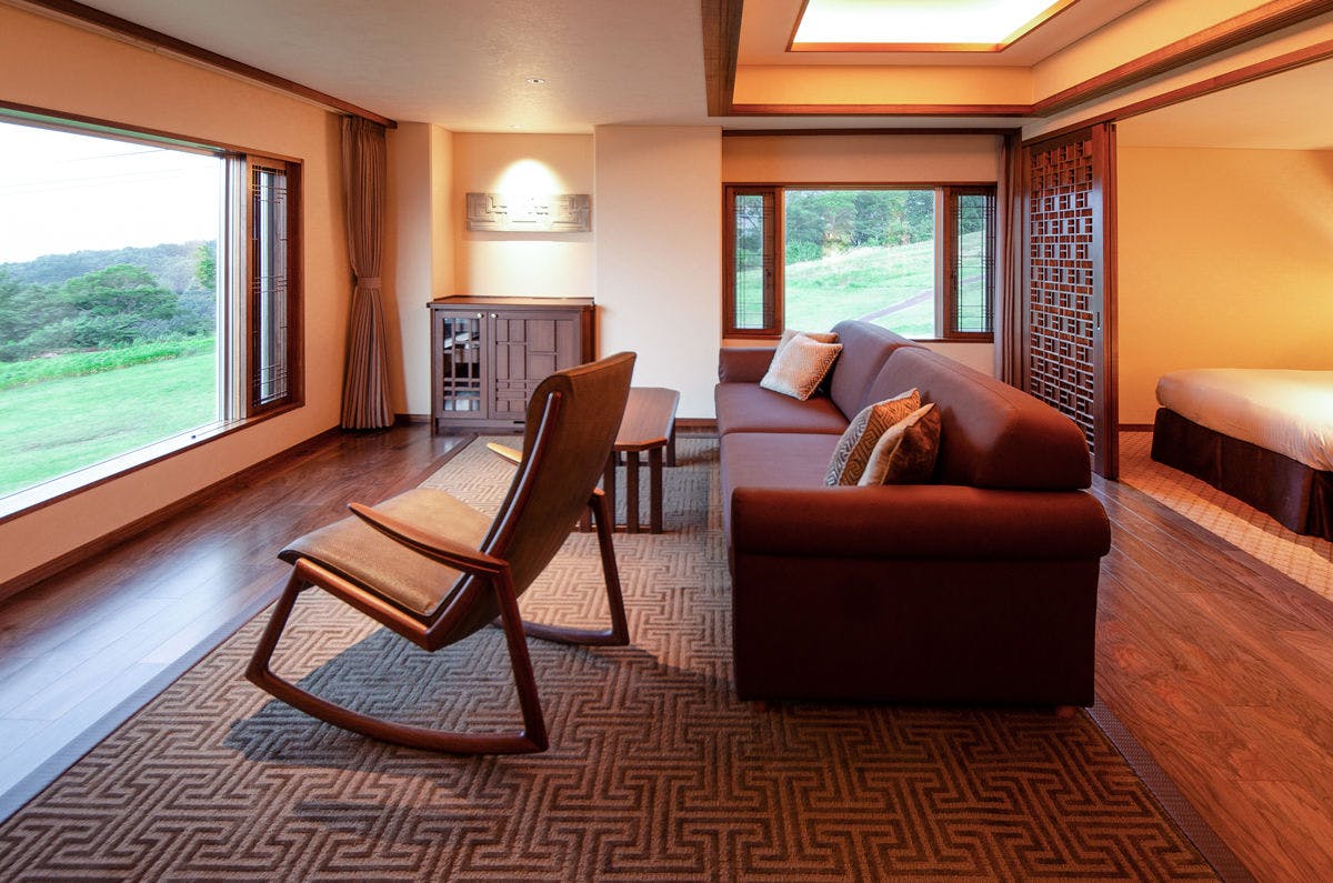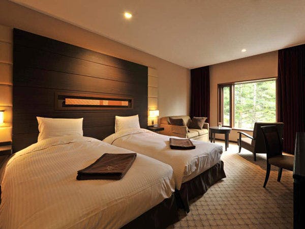 他のツインルームより1.5倍ほど広い、野尻湖側の眺望の良いお部屋です。リビングスペースにはカウチソファとロッキングチェアがございます。贅沢なつくりのバスルームには、ブロアバスがあり、ゆったりとご利用いただけます。(お風呂は温泉ではございません)