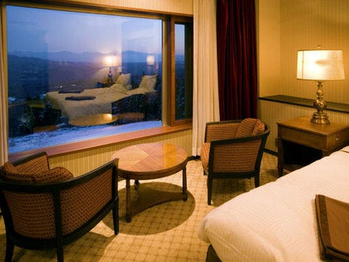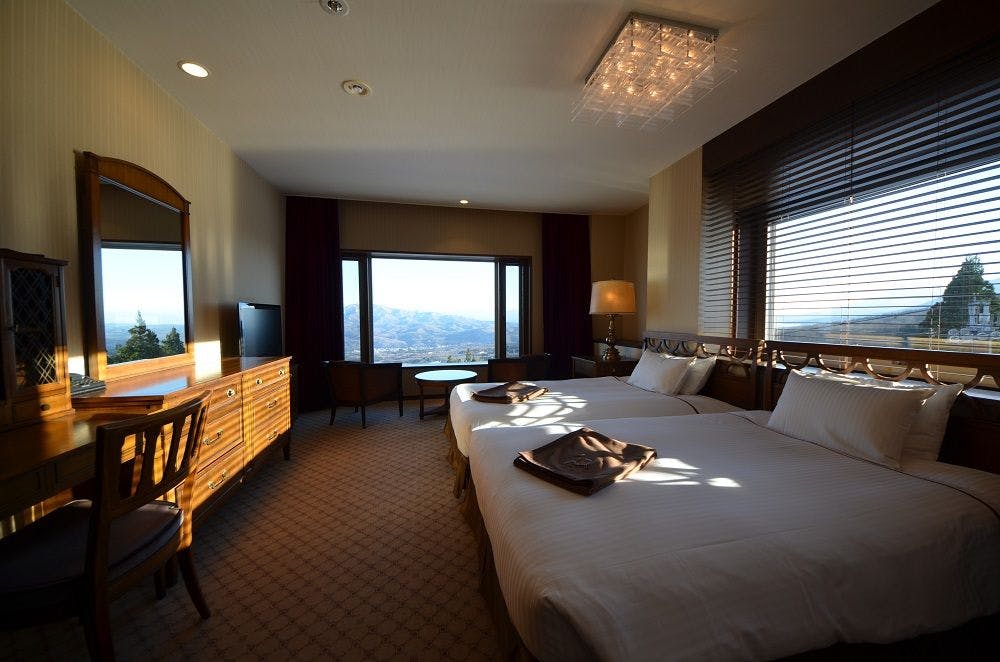 野尻湖側の眺望の良いお部屋です。窓からは遠くに信越の山々や野尻湖などを望む雄大な景色が広がります。ただし、下方にはレストランやホテル別棟の屋根が見えます。