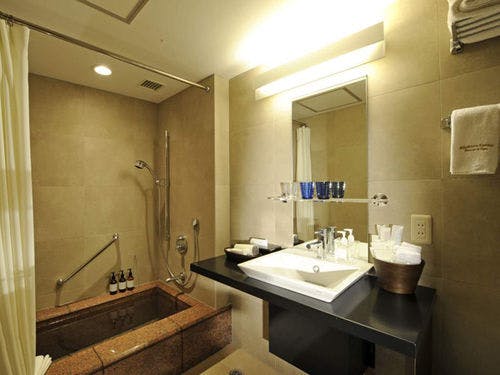 温泉の内風呂がございます。内風呂の窓からは居室同様の景色がご覧いただけます。ご利用いただく際に温泉を浴槽にためて、ご入浴いただけます(かけ流しではございません)。