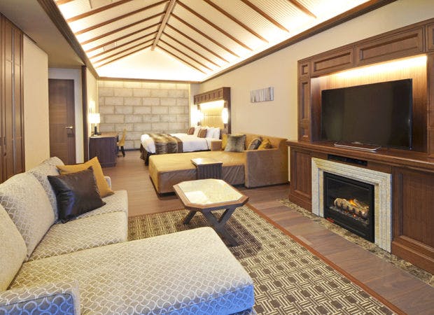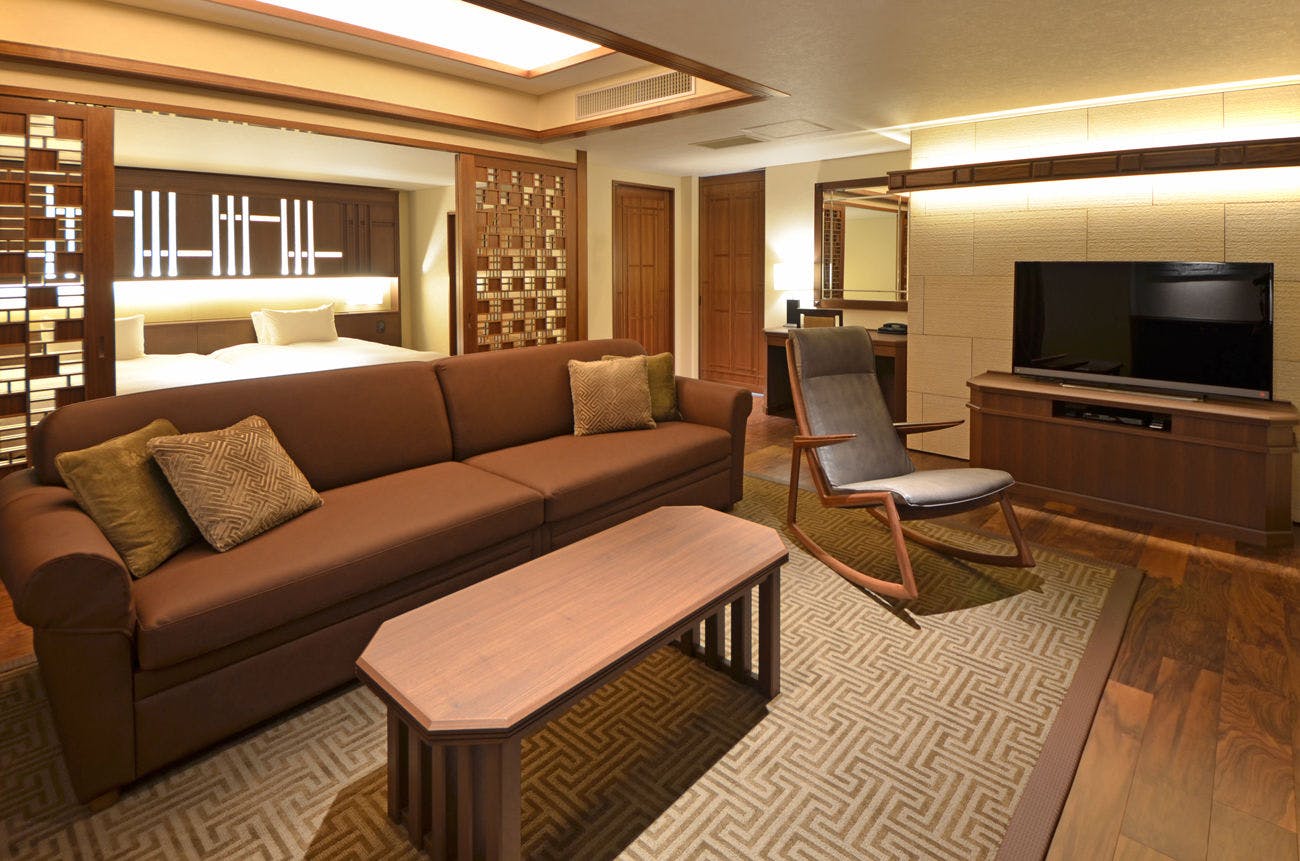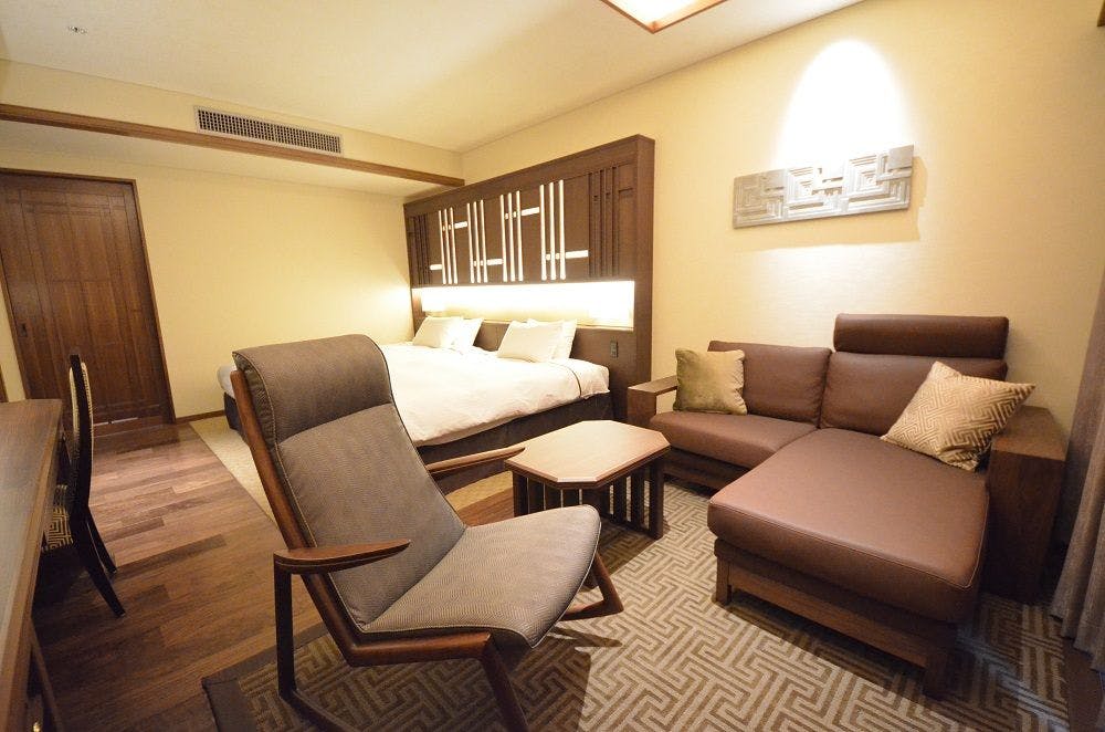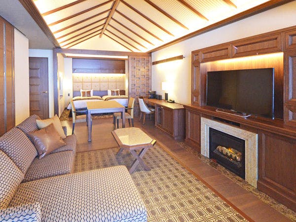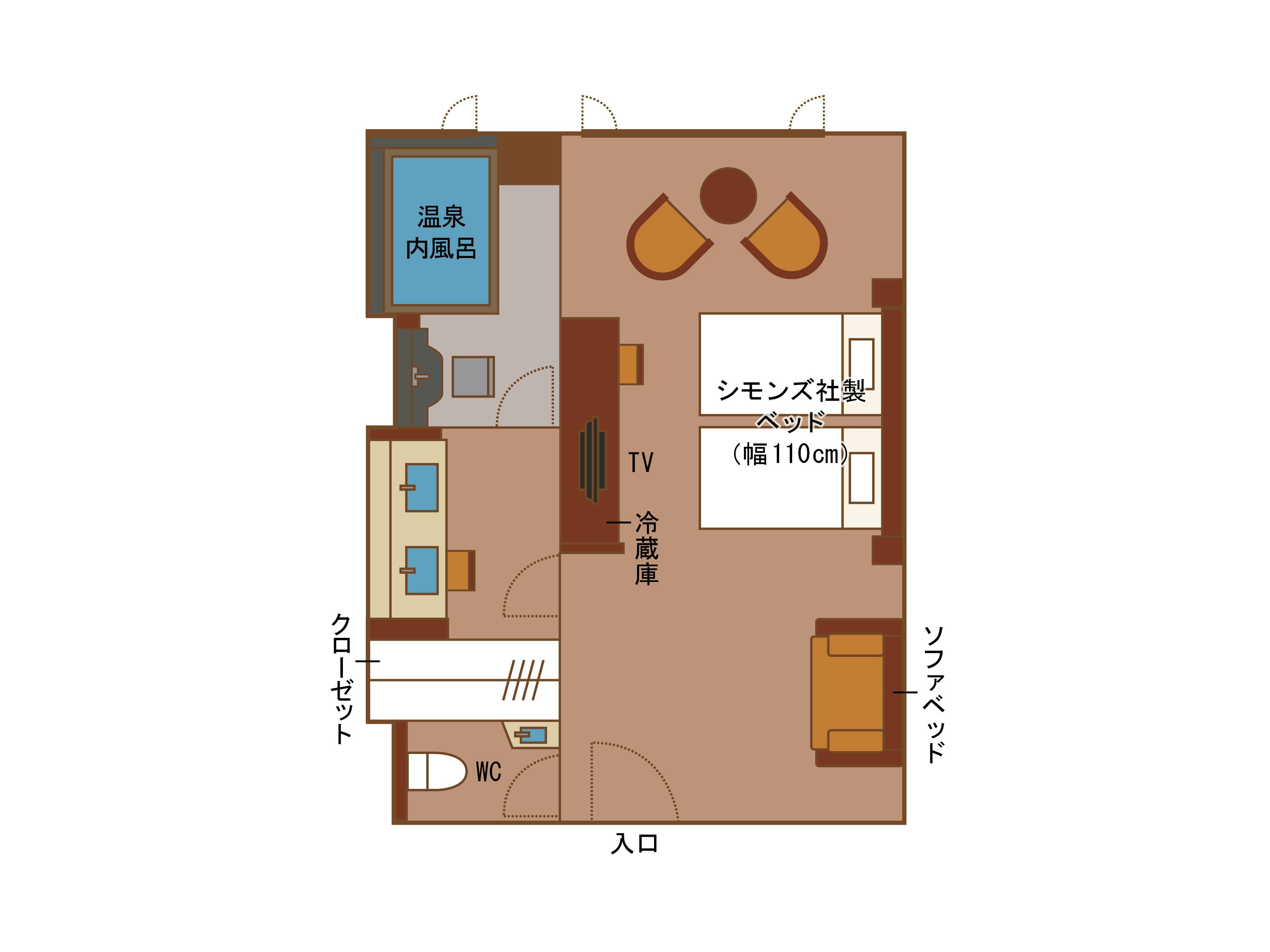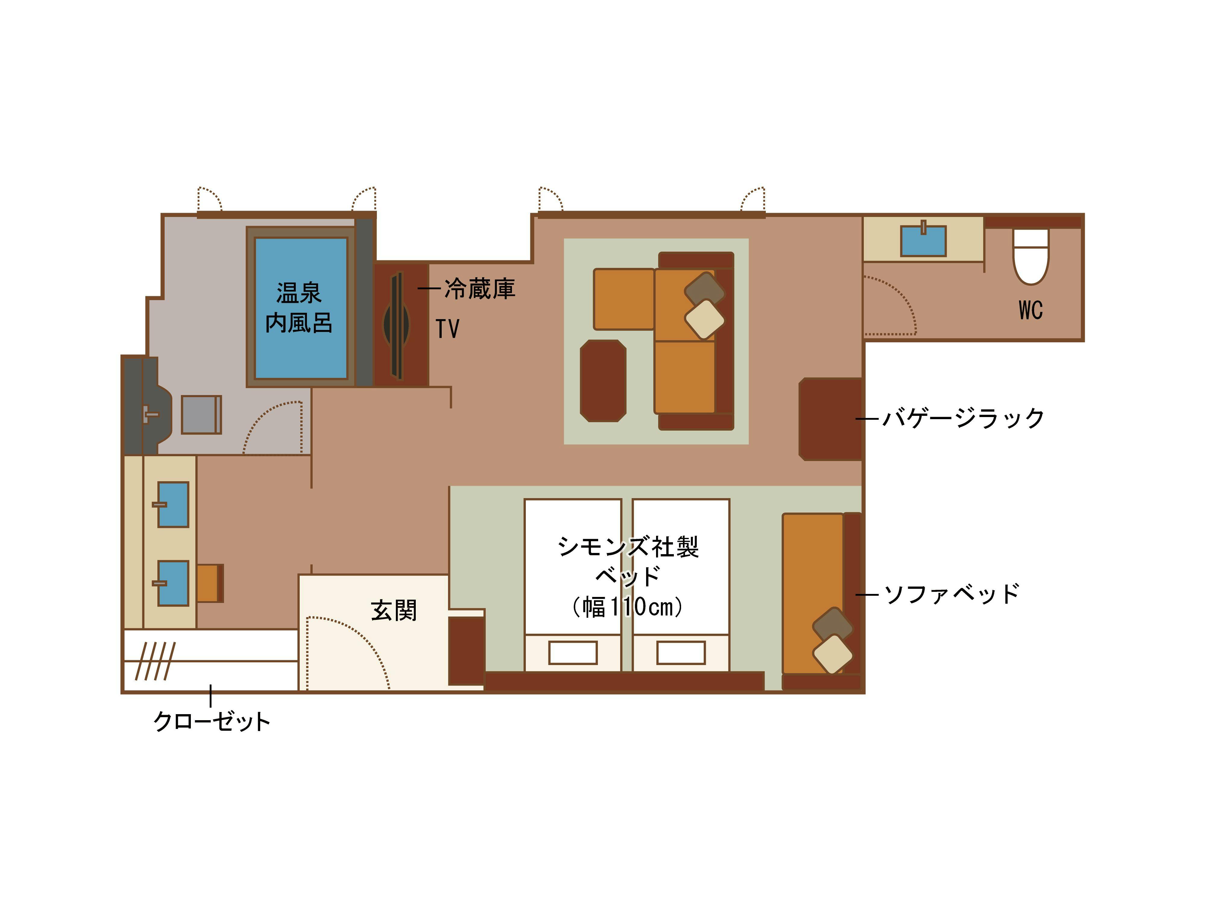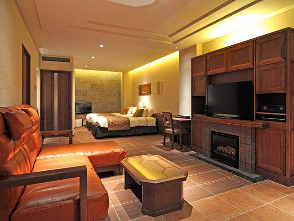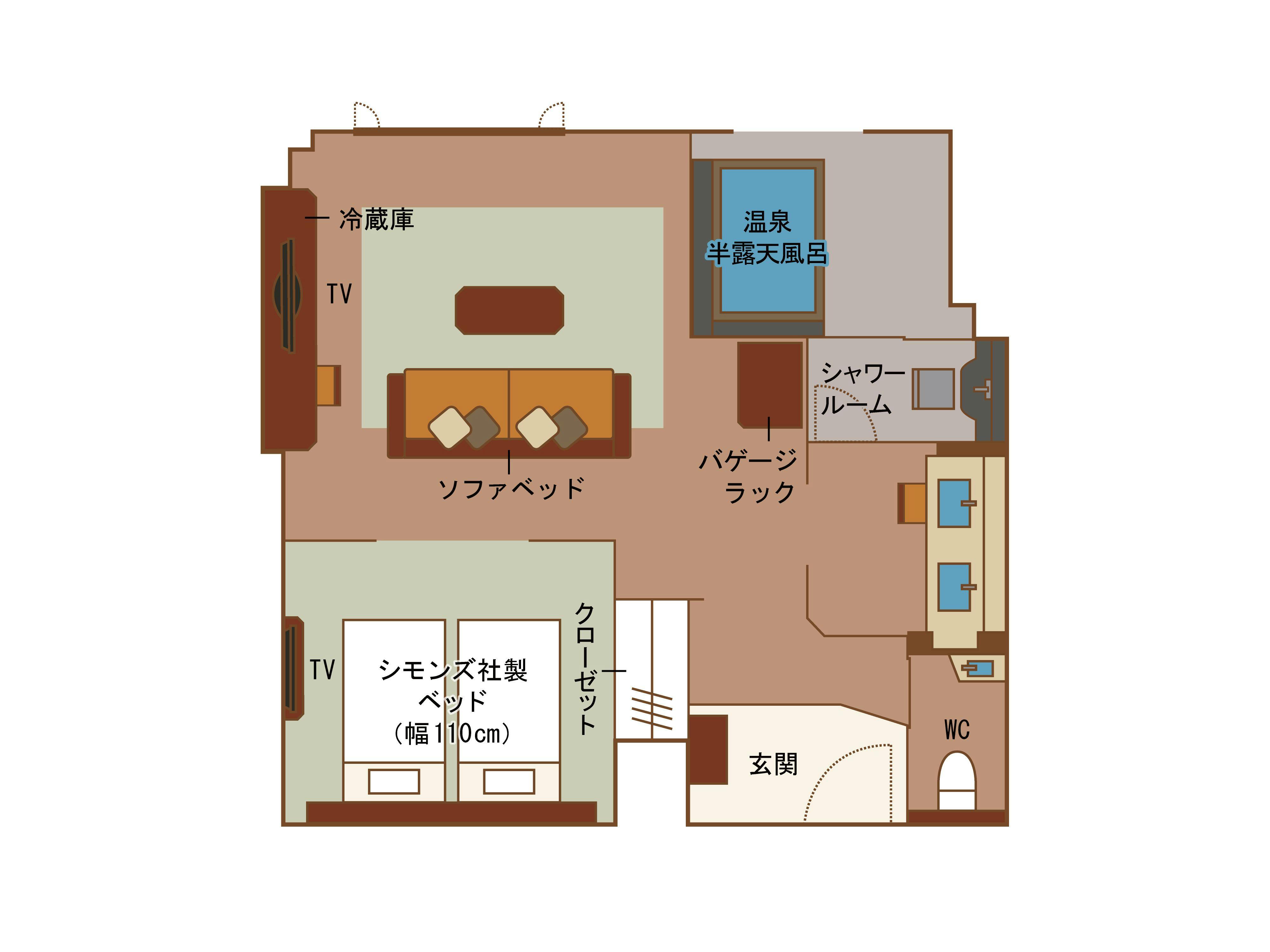 本館スタンダードツインより2倍近く広いお部屋です。ベットルームにはダブルベット1つ、リビングスペースにはカウチソファとロッキングチェア、ダブルのソファベットがございます。贅沢なつくりのバスルームは、ゆったりとご利用いただけます。(お風呂は温泉ではございません)
