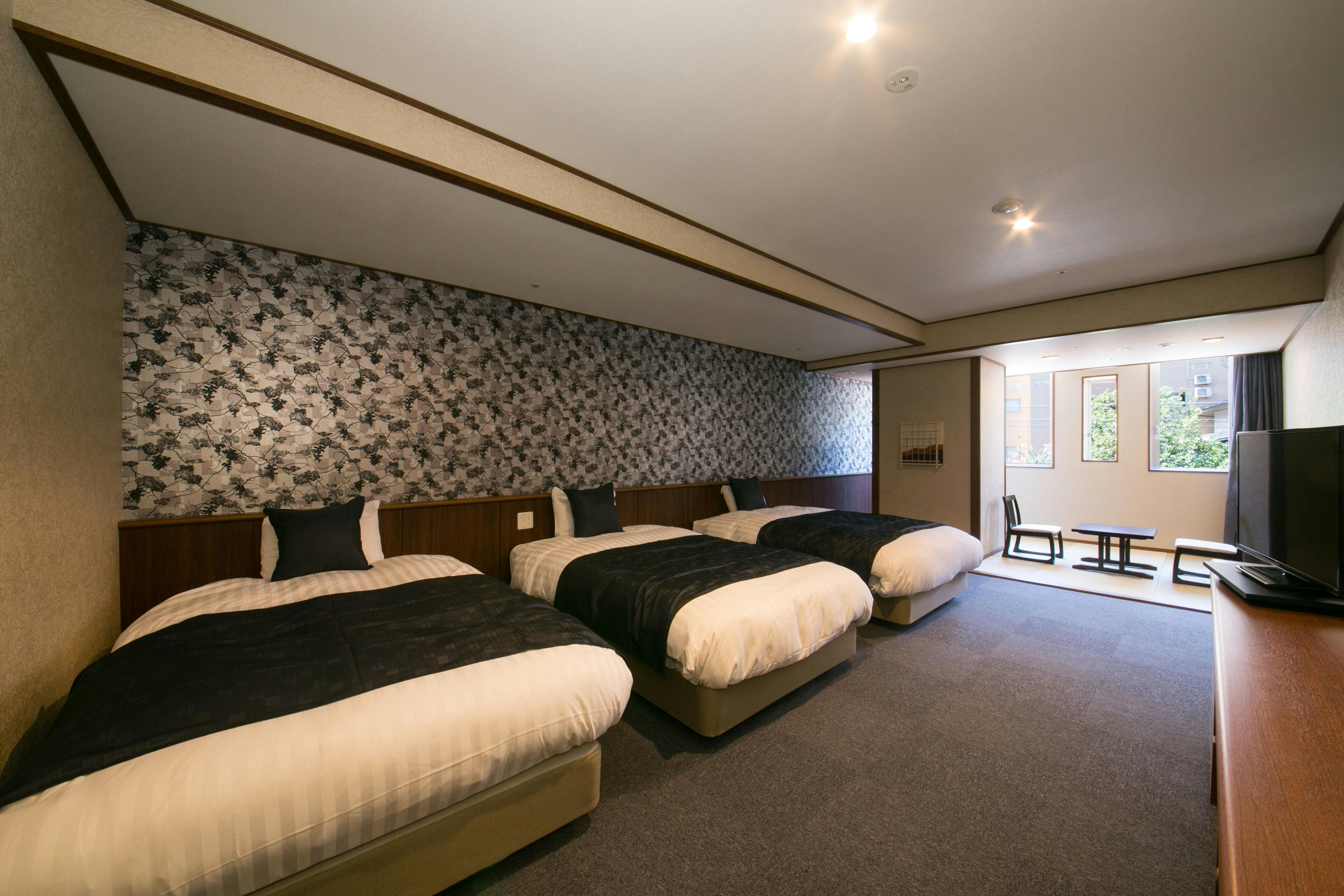 セミダブルのベッド3台と和控えが付いた、段差が少ない使い勝手の良いお部屋タイプです。落ち着いた雰囲気のお部屋でごゆっくりとお寛ぎください。・全室禁煙・Wi-Fiでインターネットをご利用いただけます。(パソコンの貸出しはございませんのでご持参下さい)