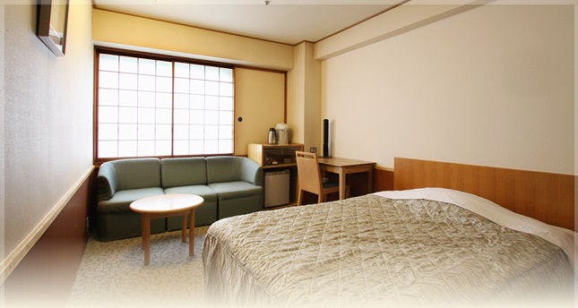 一人旅に最適!ゆとりのセミダブルのベッドをご用意した洋室です。ソファーを備え付けており、ゆったりとお過ごしいただけます。※山側のお部屋ですのでご了承ください※お部屋までのご案内は、状況により致しかねる場合がございますので、予めご了承下さい。