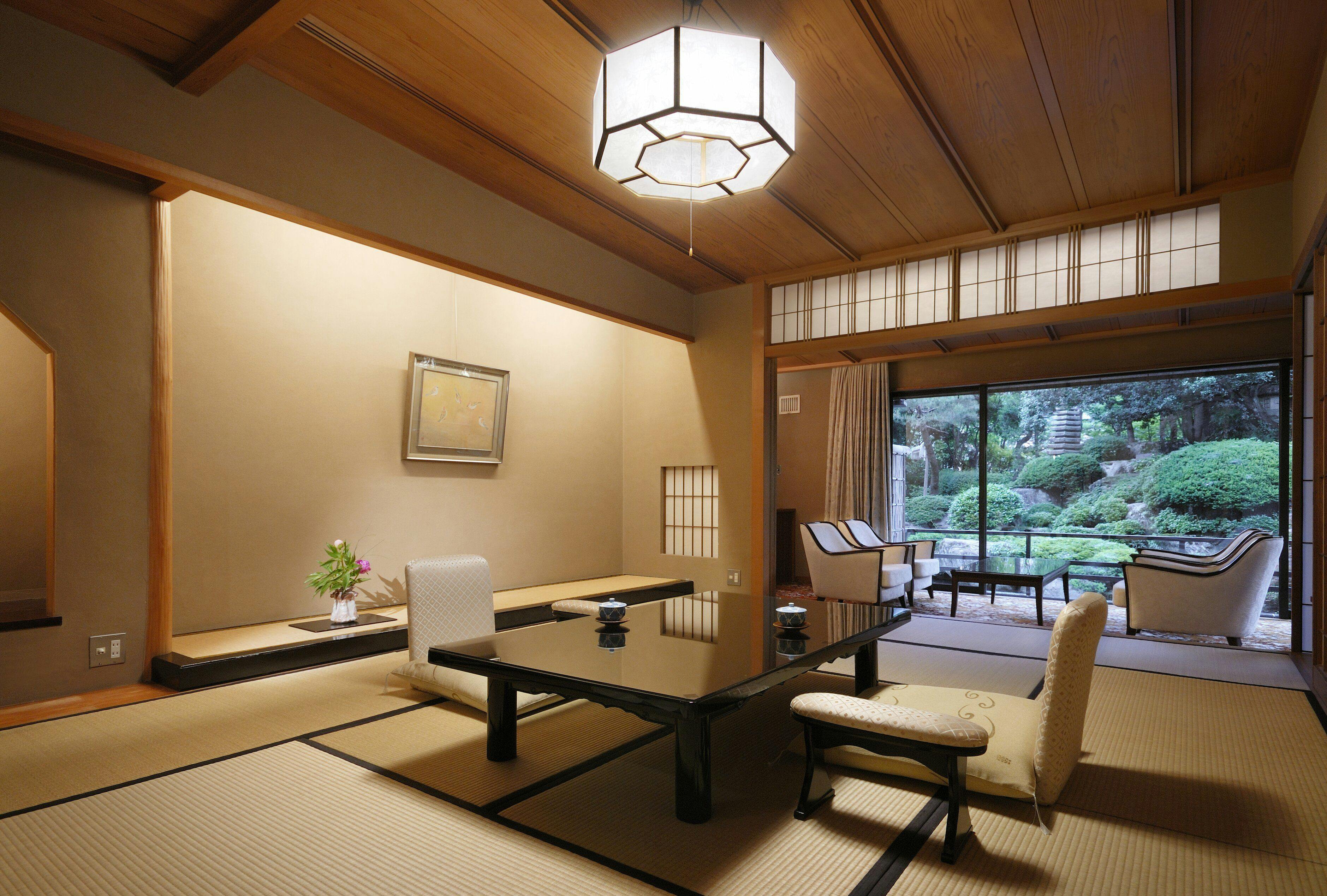 山水閣1階に3室しかない特別室。静寂の日本庭園、悠々と泳ぐ鯉・・・この景色を独り占めするような和の風情につつまれた優雅な和室。12畳の本間とツインの和洋室、または、12畳の本間と8畳の和室からなる寛ぎのお部屋タイプです。室内風呂では、滑らかな下呂の源泉をゆったりとお楽しみいただけます。※掲載写真は一例です。