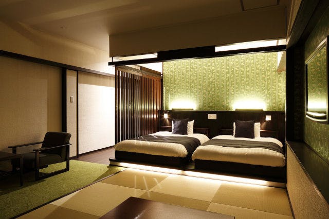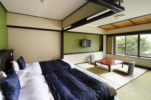 おやすみはベッドという方には和室+ツインベッドの和洋室がおすすめです。窓をあければ、爽やかな風に乗って緑の薫りが広がります。