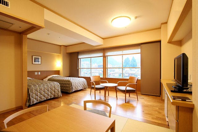 6畳の畳とツインベッドのある和洋室。飛騨の木材を取り入れた、光差し込む明るい雰囲気のお部屋です。一部バリアフリーの段差の少ないお部屋(4部屋)もご用意致しております。禁煙のお部屋タイプです。