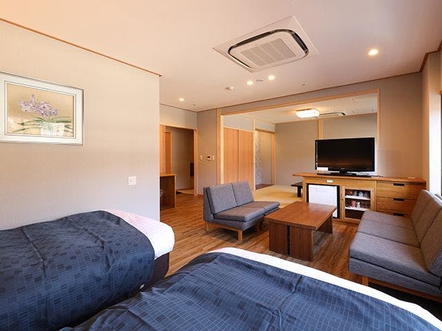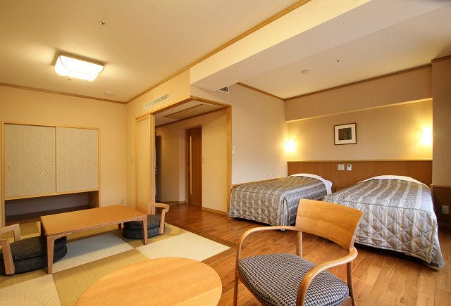 セミダブルのベッド2台と和控えが付いた、段差が少ない使い勝手の良いお部屋タイプです。落ち着いた雰囲気のお部屋でごゆっくりとお寛ぎください。・全室禁煙・Wi-Fiでインターネットをご利用いただけます。(パソコンの貸出しはございませんのでご持参下さい)