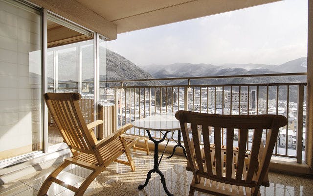 「臨川閣」最上階12階限定の4室しかないお部屋タイプ。全室に清流飛騨川と下呂温泉の街並みを一望いただけるバルコニーがあり、最上階だけの壮大な景色をお楽しみいただけます。そしてお部屋には源泉かけ流しの温泉を引いた木の香漂う高野槙の室内風呂を完備。お部屋は、踏込みと12.5畳に6畳の次の間を備えたゆとりの和室。(83平米)木のぬくもりと先進の技術が共存する臨川閣は、すみずみまで調えられた和の粋が自慢です。日本の伝統美が織りなす雅空間を心行くまでお楽しみ頂けます。