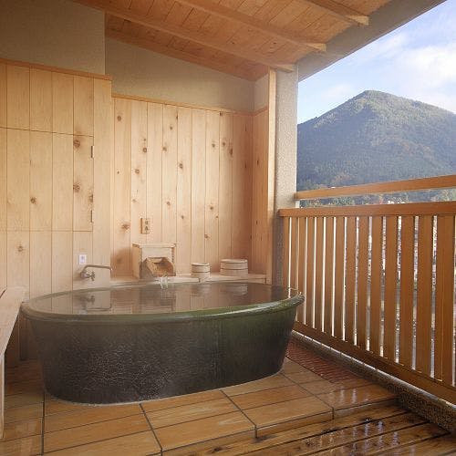 全室に清流飛騨川と下呂温泉の街並みを一望いただけるバルコニー付。また、室内には源泉かけ流しの天然温泉を引いた木の香漂う高野槙のお風呂を備えております。お部屋は、踏込みと12.5畳に6畳の次の間に2台のベッドをご用意した和洋室。(83平米)日本の伝統美が織りなす雅空間を心行くまでお楽しみ頂けます。