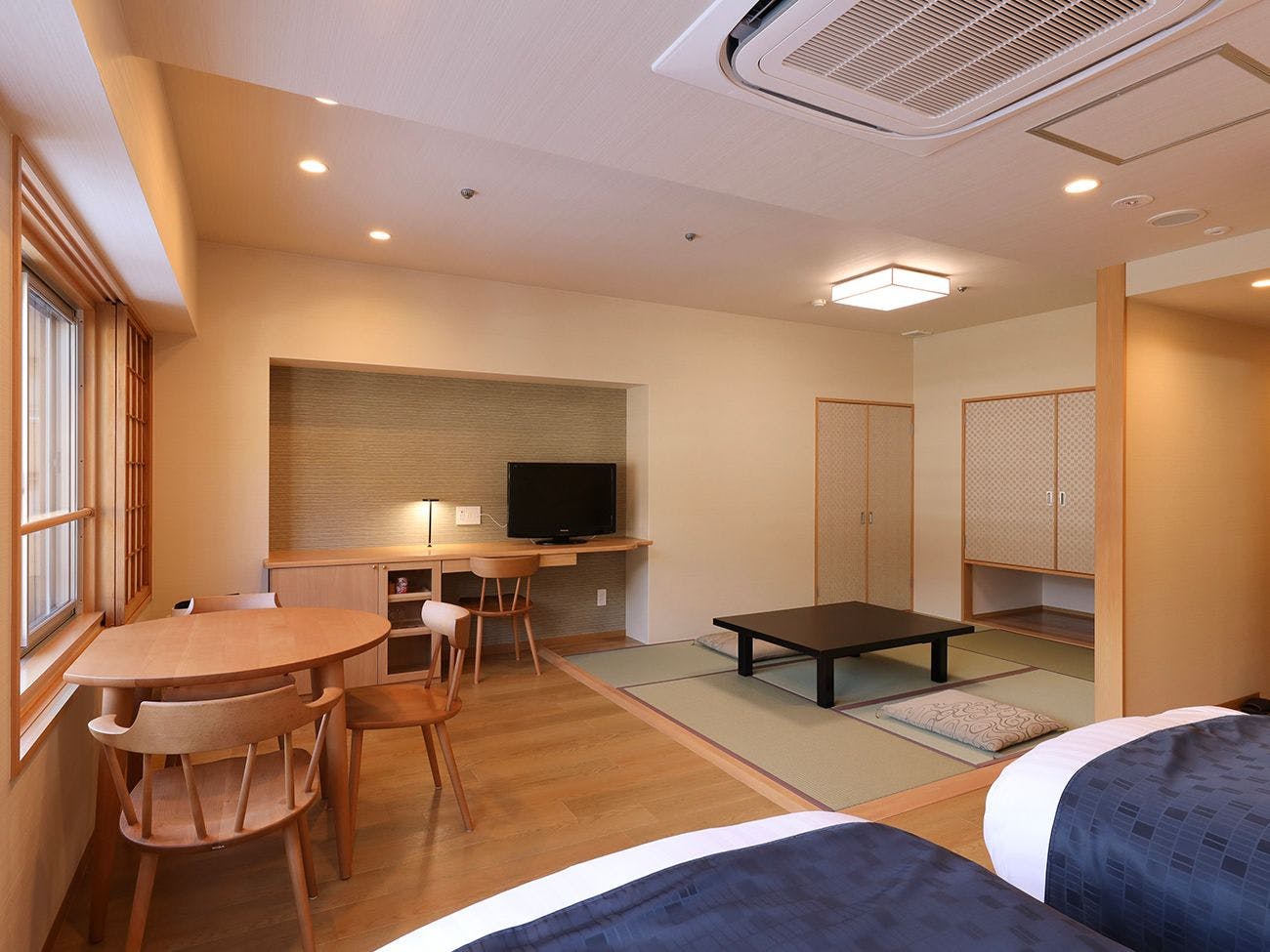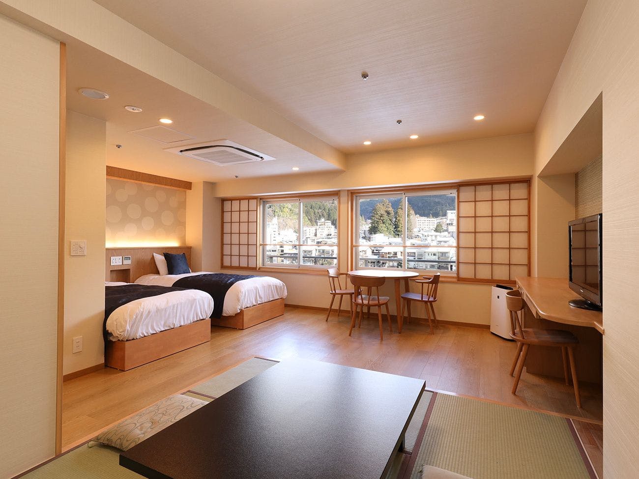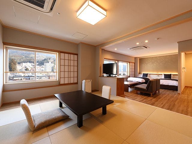 飛泉閣の「6階」にある和洋室を2022年12月にリニューアルOPEN!飛騨の雄大な山々を一望できる段差の少ない和洋室。