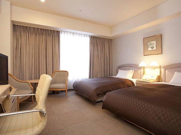 □ツインタイプ(ベッド幅120cm×2台/12階) 喫煙可能■Wi-Fi&有線LAN完備(無料)■個別空調導入■加湿機能付空気清浄機完備■シモンズ社製ベッド採用■32型液晶テレビ■ベッドサイドにコンセント完備■マイナスイオンドライヤー完備■ルーム消臭剤完備■VODシステム(※有料1,000円)