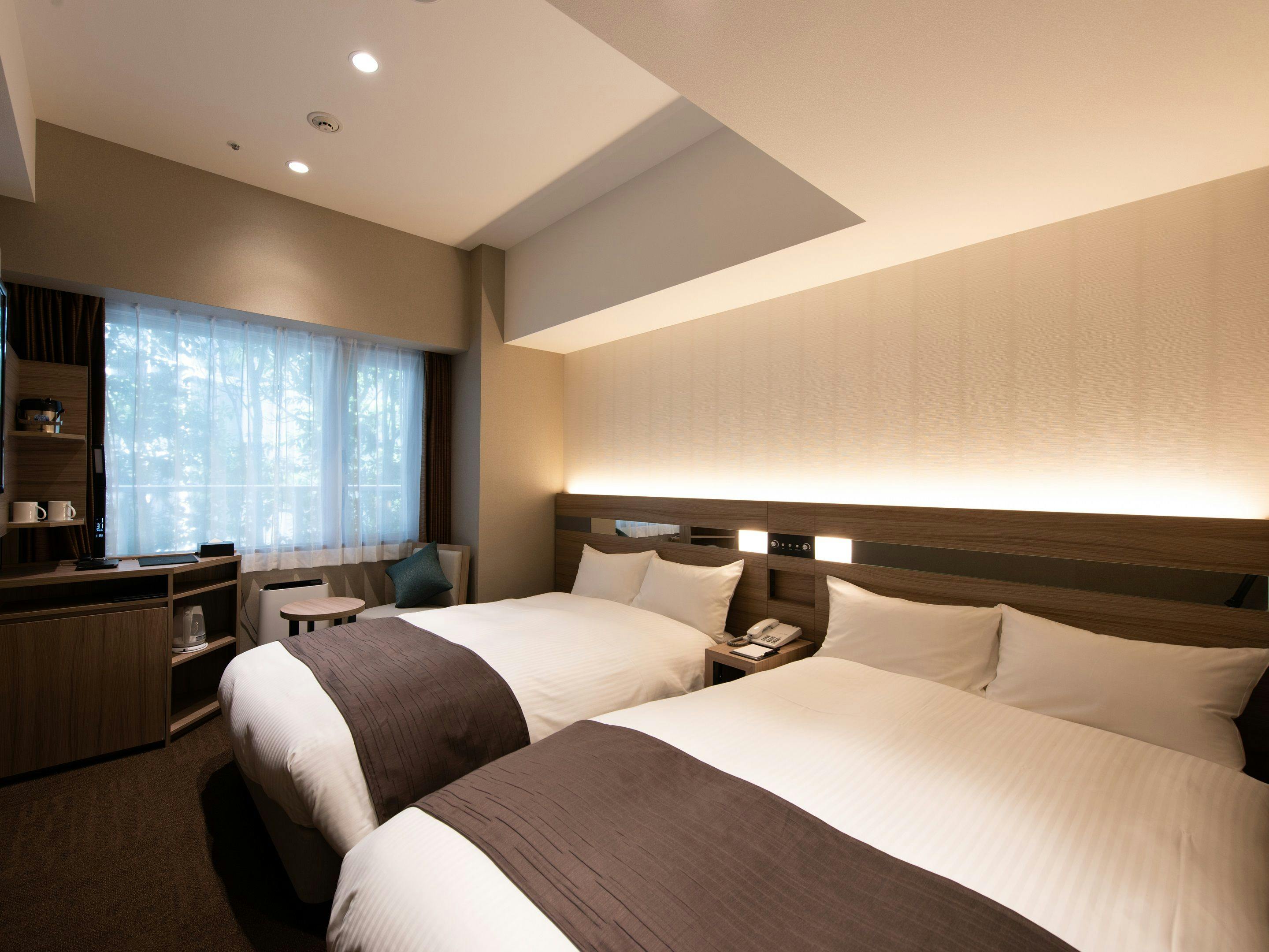お部屋2部屋をお隣同士でご利用いただくお部屋です。・広さ 29~33平米・ベッドサイズ 幅120cm×長さ210cm-2台・シーツはデュベスタイル・全室有線LAN完備/インターネット接続無料・※ベット1台追加時 110cm×188cm-1台