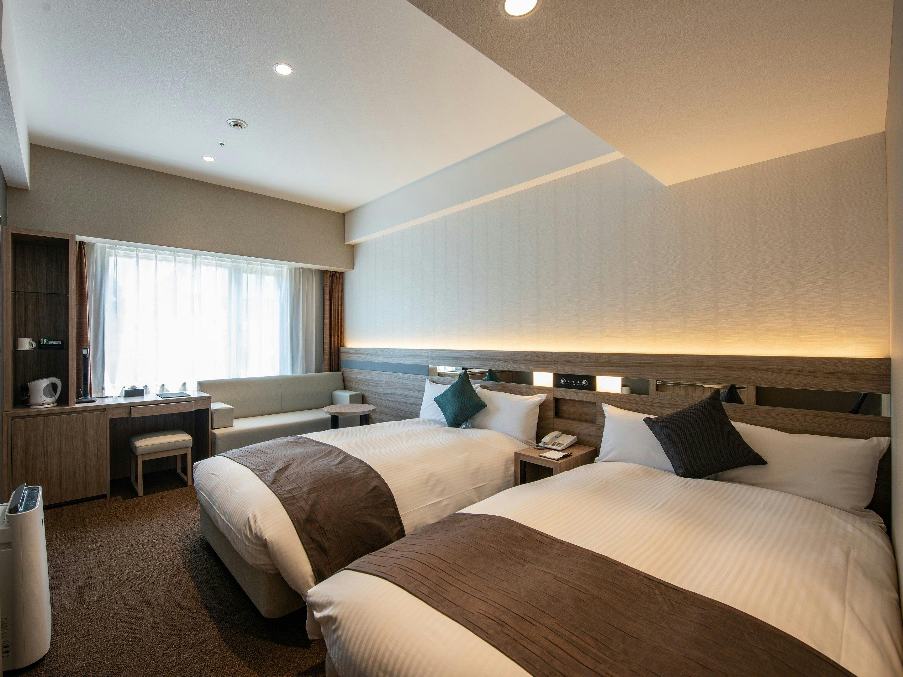 2018.08.01オープン「ホテルヒューイット甲子園ウェスト」の新しい客室です。落ち着いた上質な時間をすごしていただける客室の本館に対し、新築のホテルヒューイット甲子園ウェストでは機能的で洗練された客室を提供いたします。