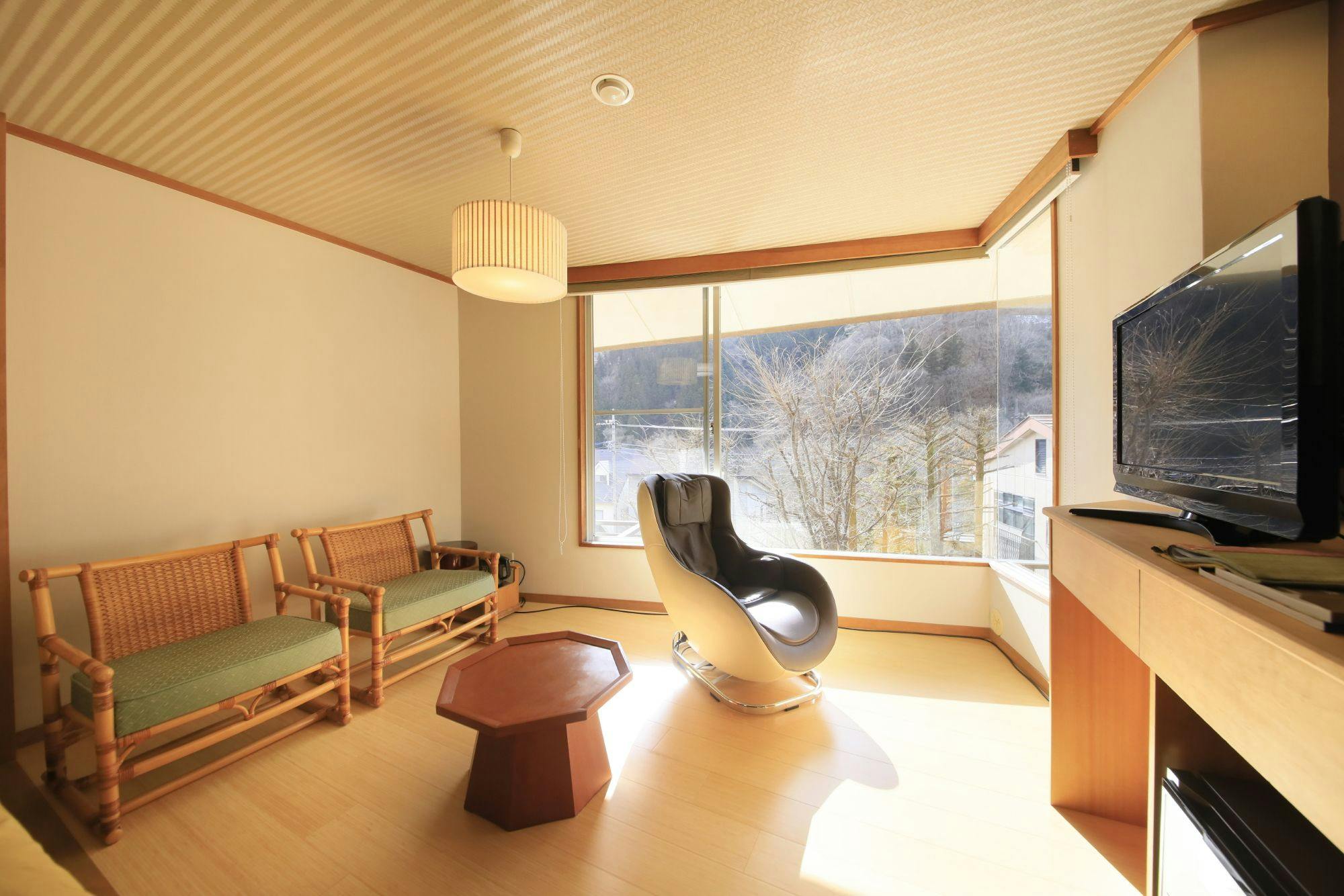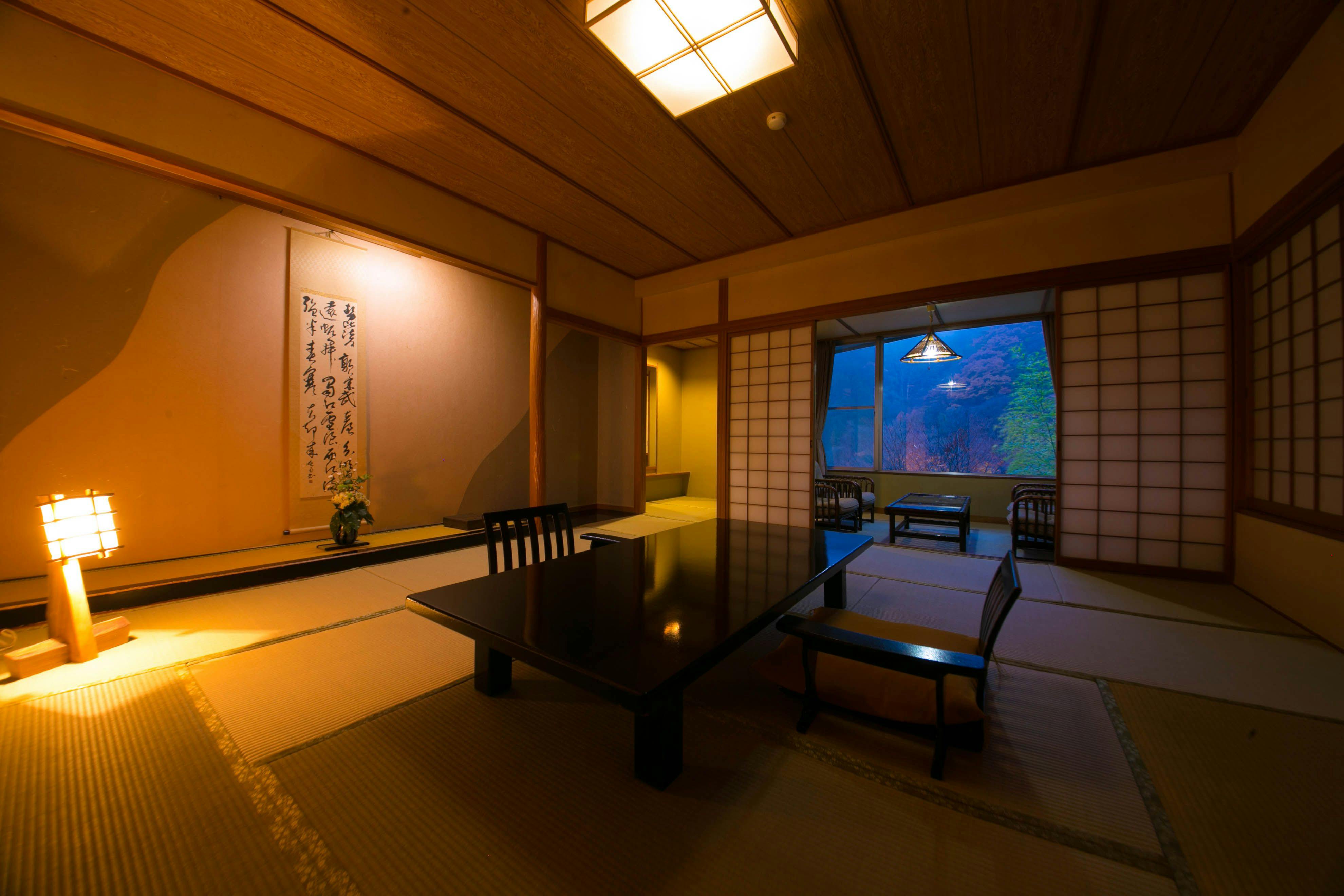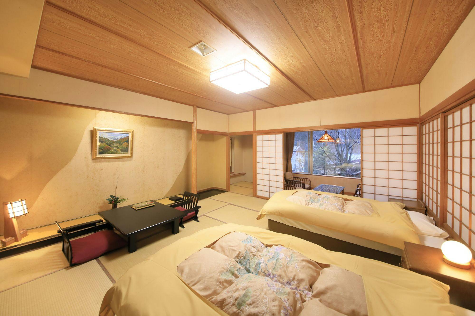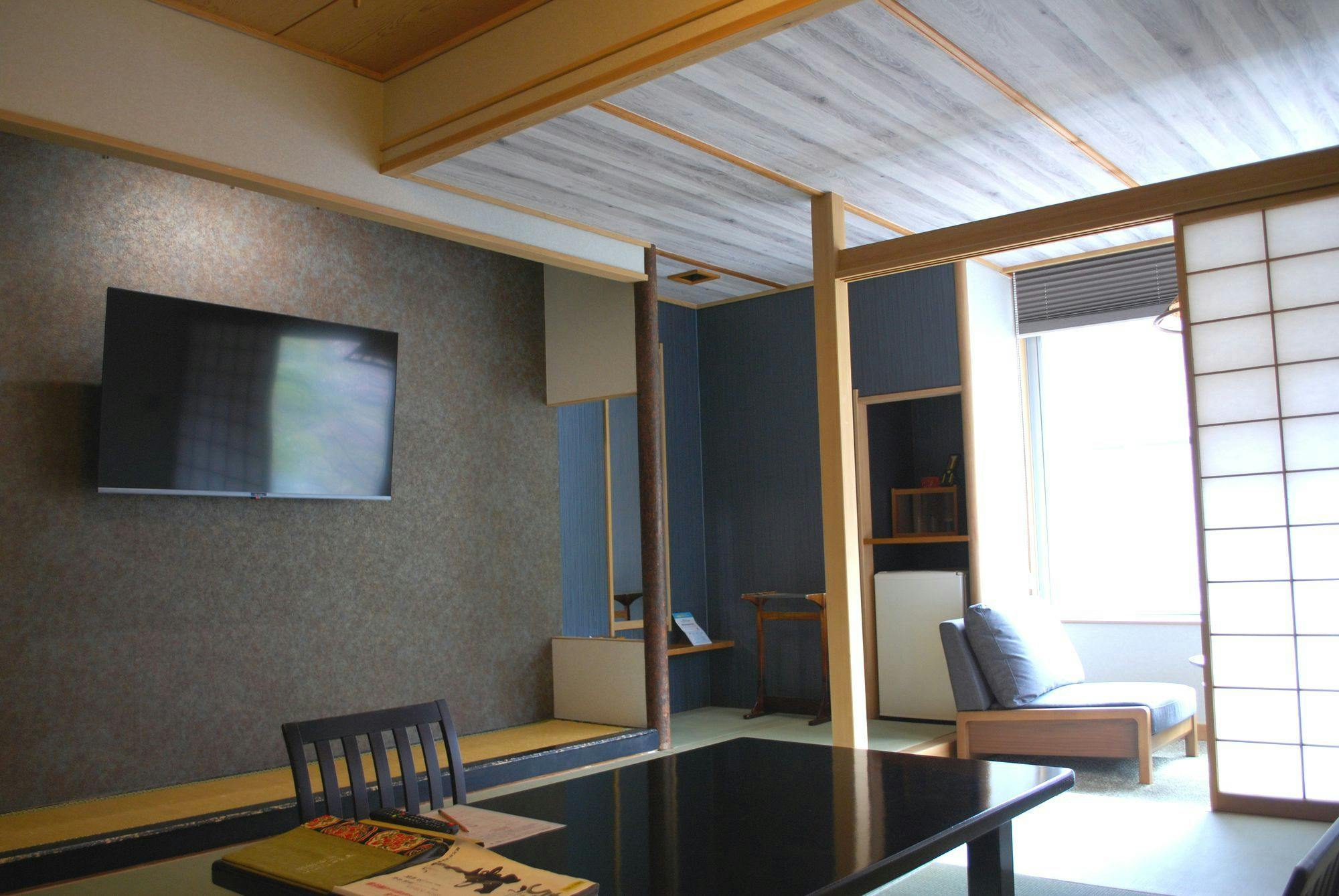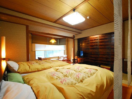 バリアフリー対応(ダイニングから居間へはスロープにて対応)で広さは露天風呂付き客室と同等のデラックスルームです。禁煙客室。