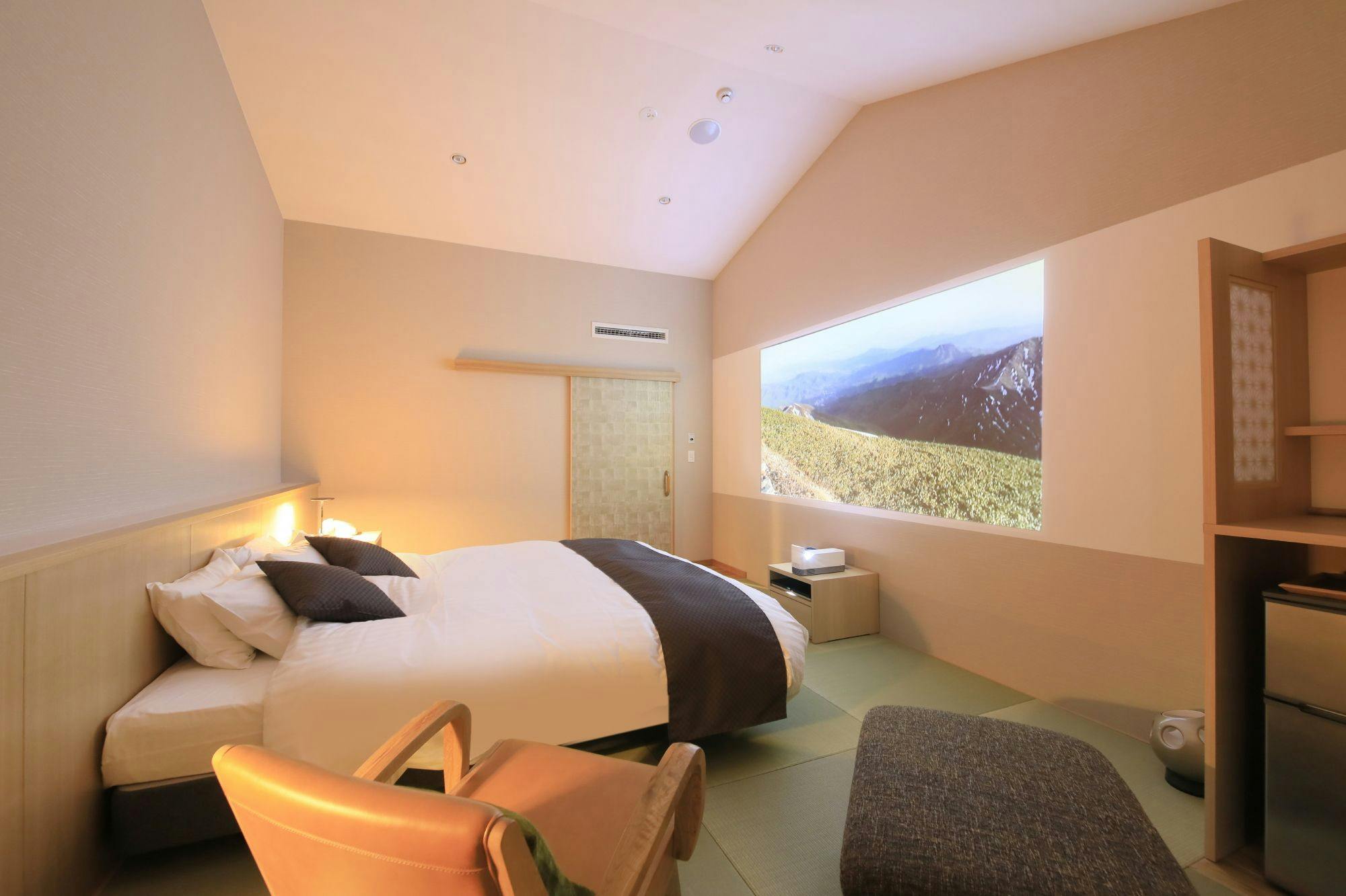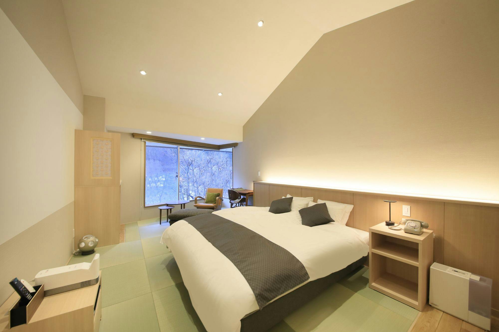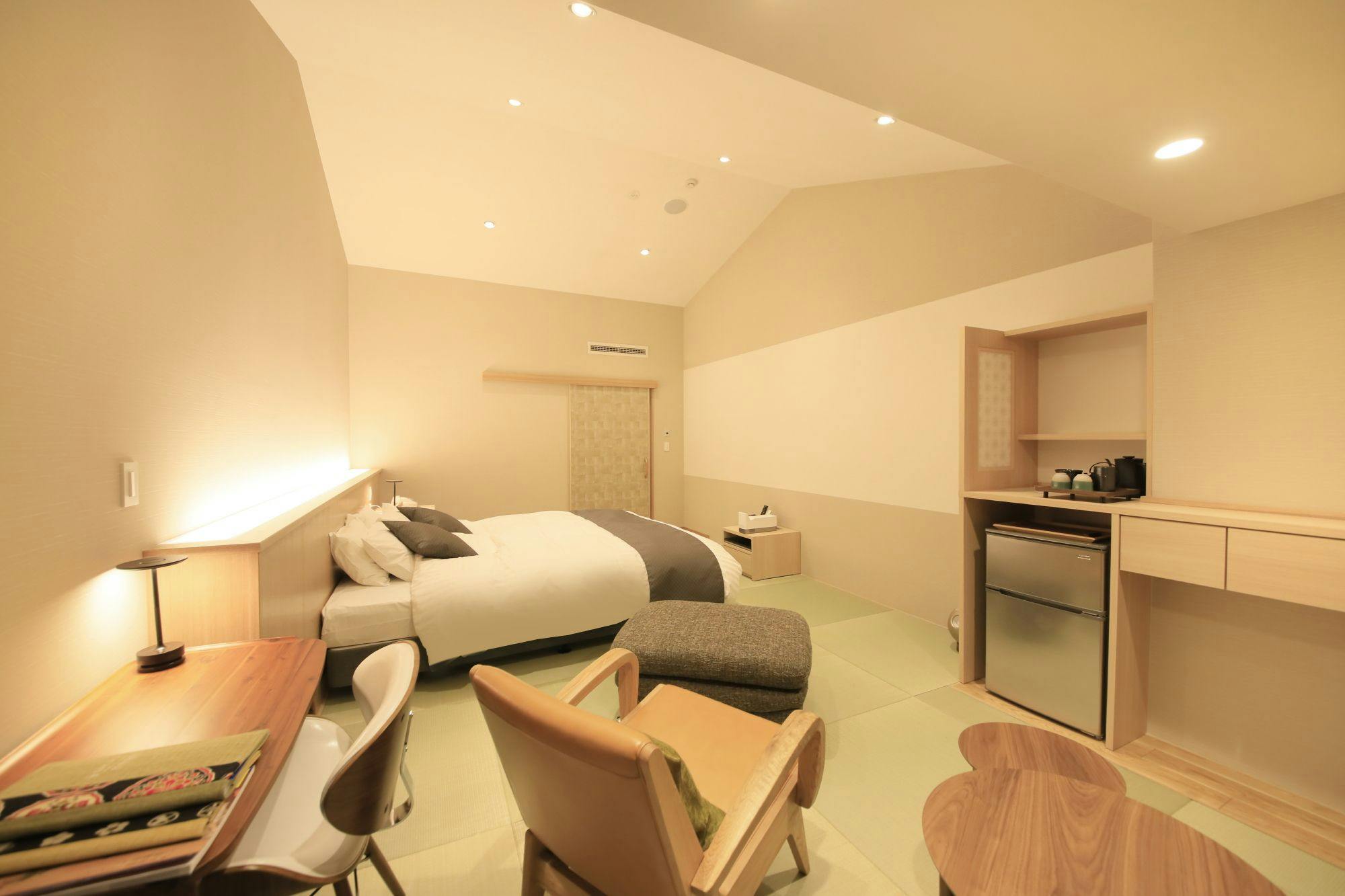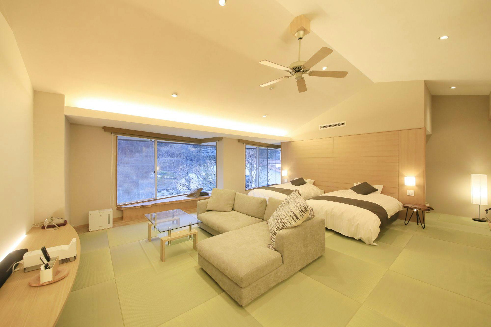 バリアフリー対応(ダイニングから居間へはスロープにて対応)で広さは露天風呂付き客室と同等のデラックスルームです。禁煙客室。