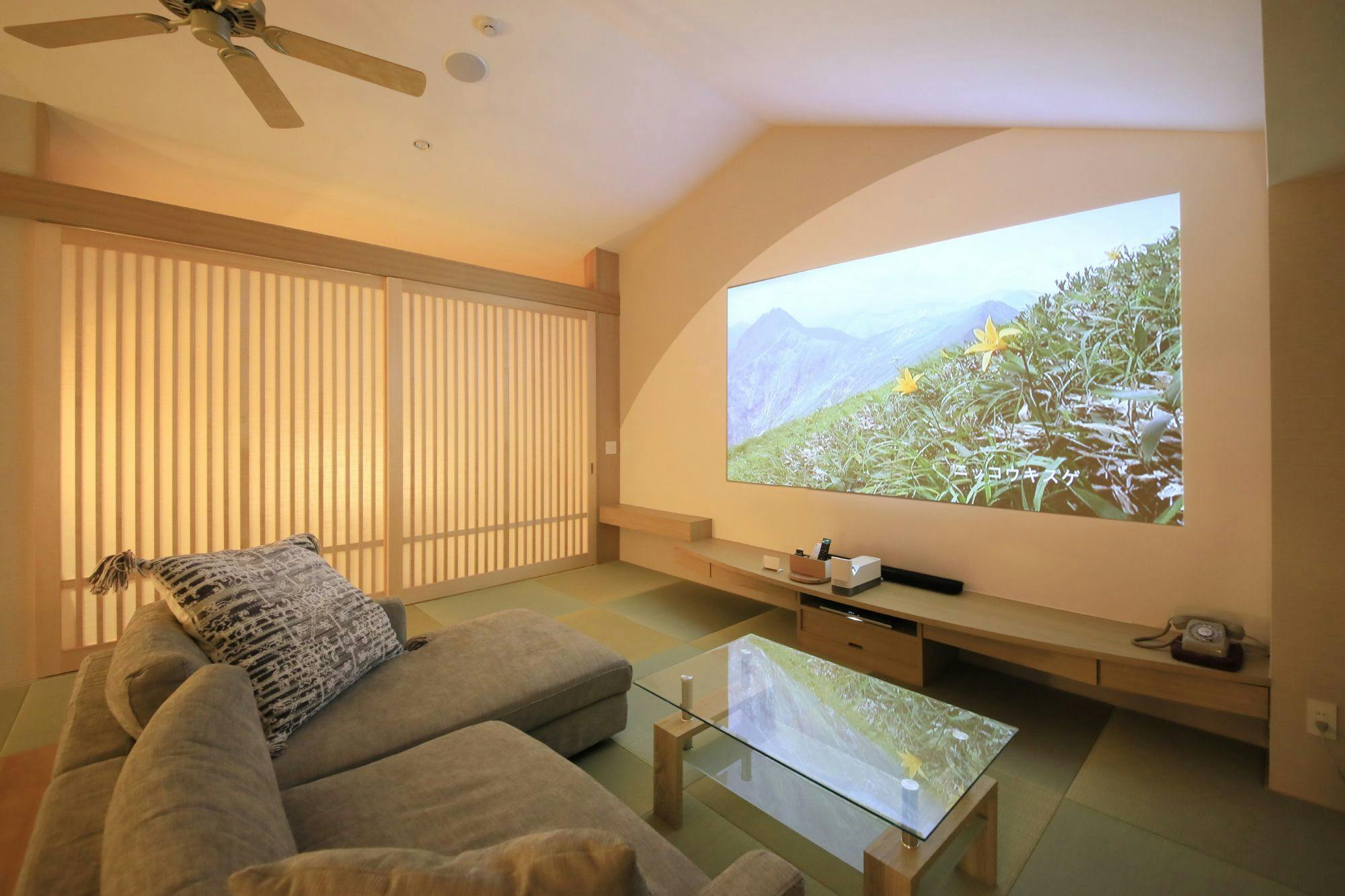 天井がとても高く開放感があります。テレビ、ブルーレイ・DVD、スマートフォン画面もプロジェクターで壁に投影、大画面でお楽しみください。(スマートフォン接続についてはHDMI接続端子を貸し出しますのでお知らせ下さい。iPhone用・Android用 各1個あり(※Android については「 USB Type-C 」が対象ですが対応してない機種もあります。))