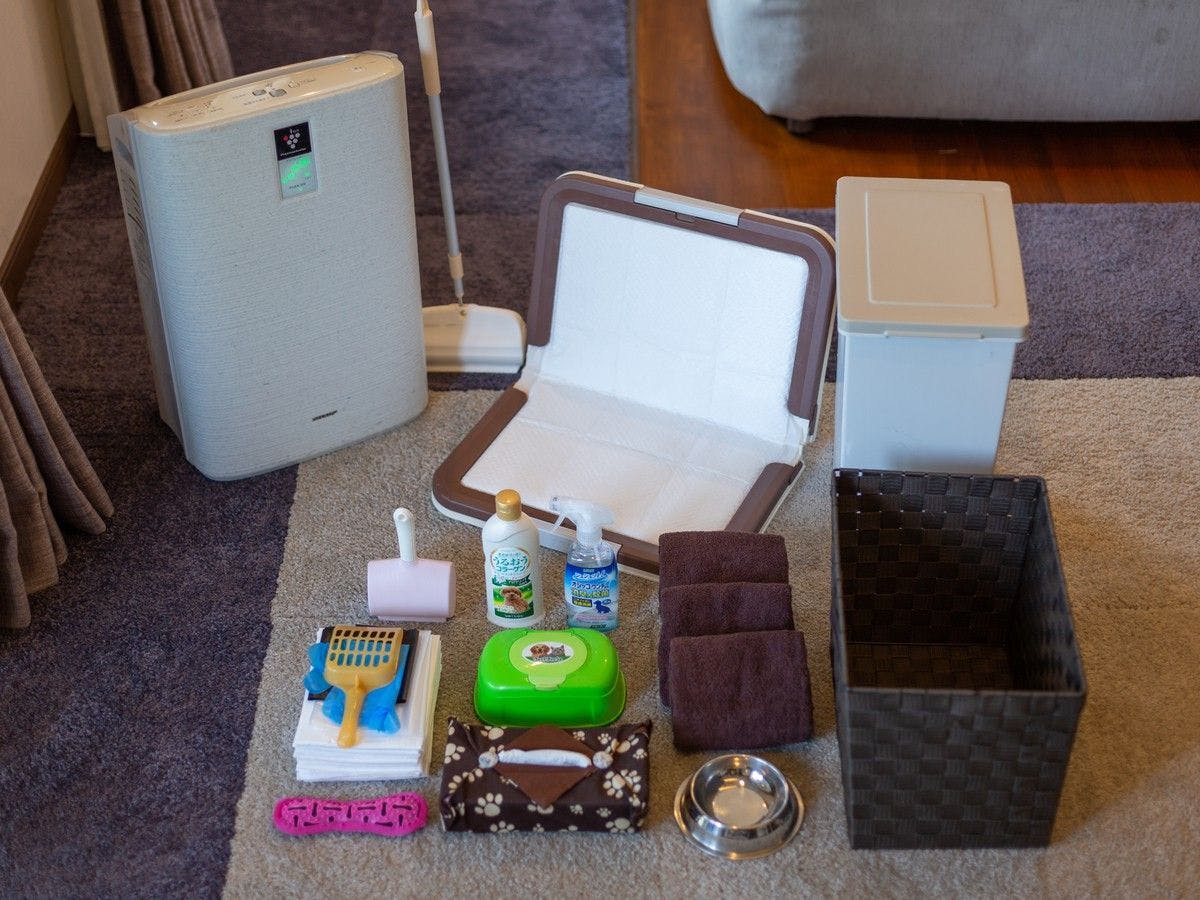 ワンちゃん用うんち回収袋、ビニール手袋、ティッシュ、食器、トイレトレー、ワンちゃん用カゴ