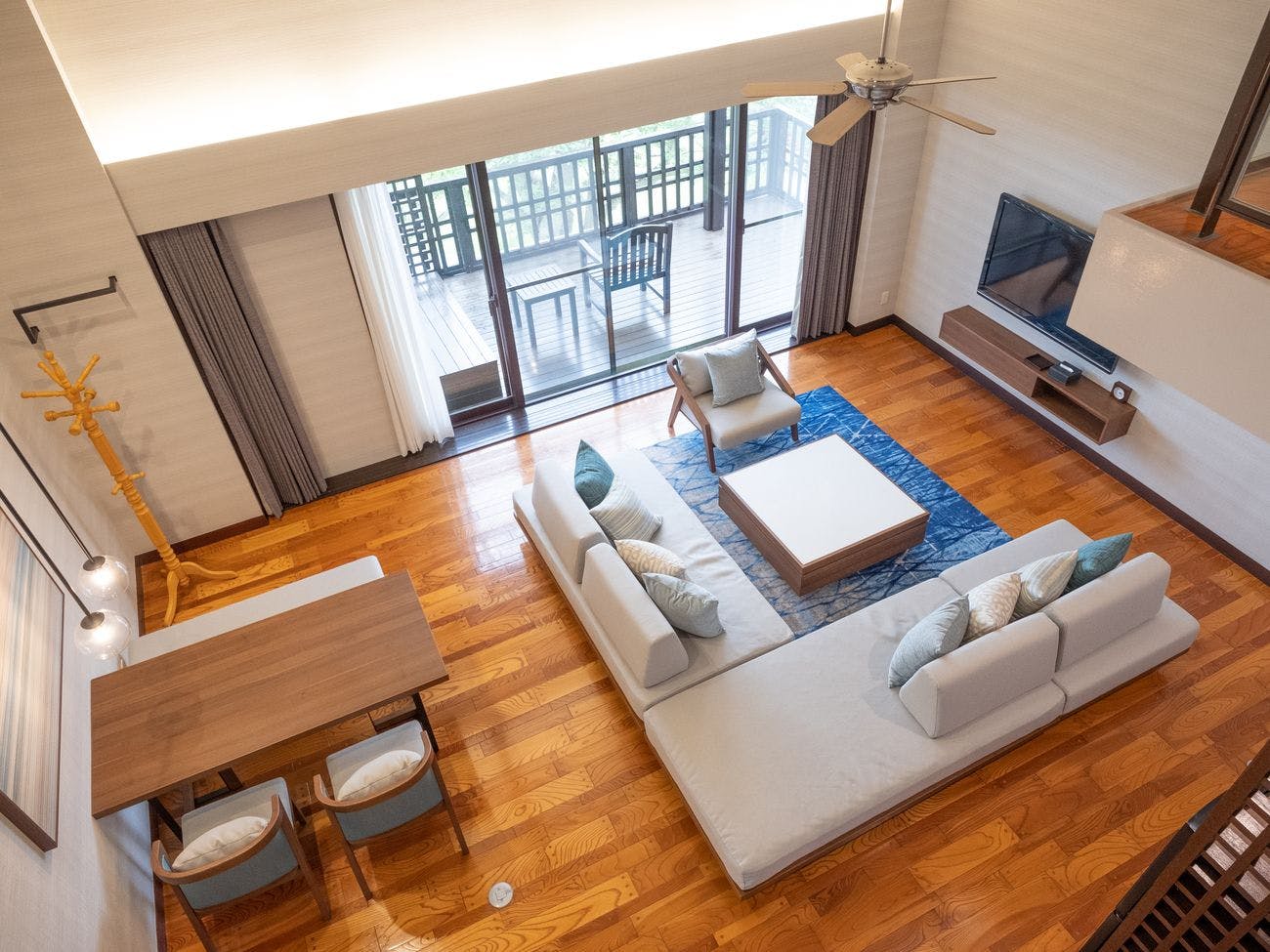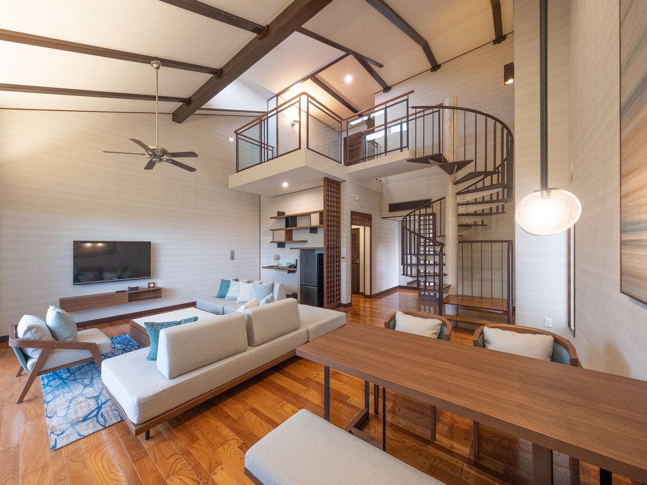 木目の美しいダークブラウンの調度と、上質なラタンの家具を配したメゾネットタイプの室内には、ベッド4台を常設。