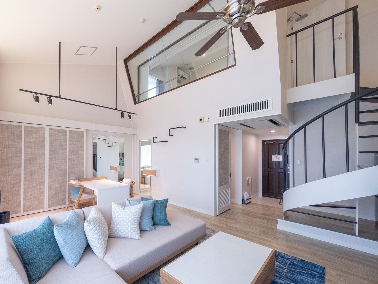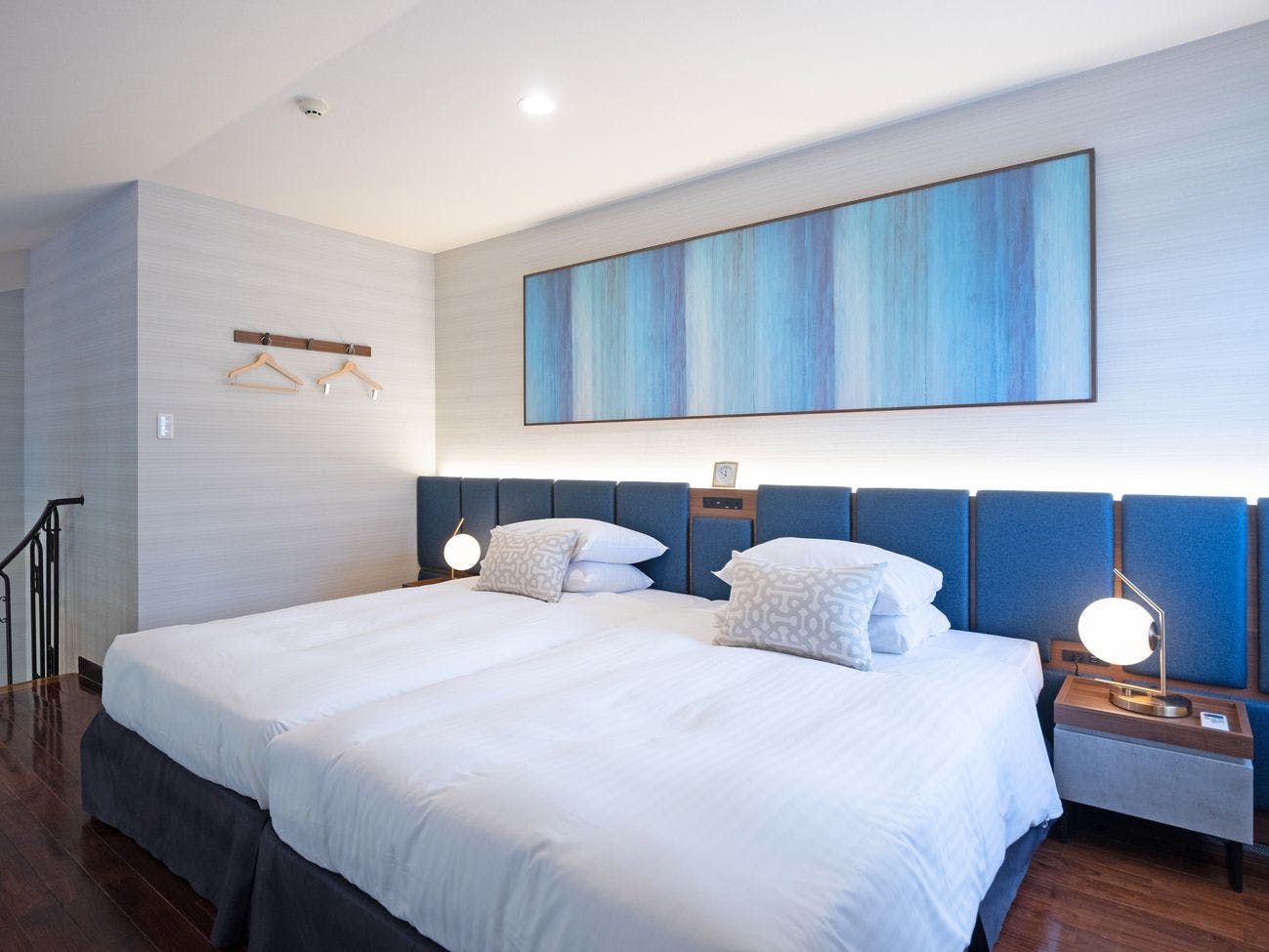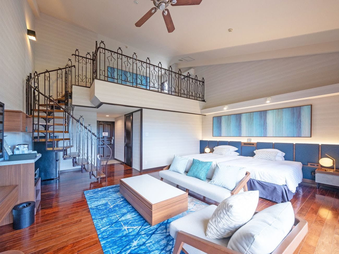 ゆったりと寛げる64平米の広さとブルーがアクセントのリゾート感溢れる空間が、お二人を上質な旅へ。