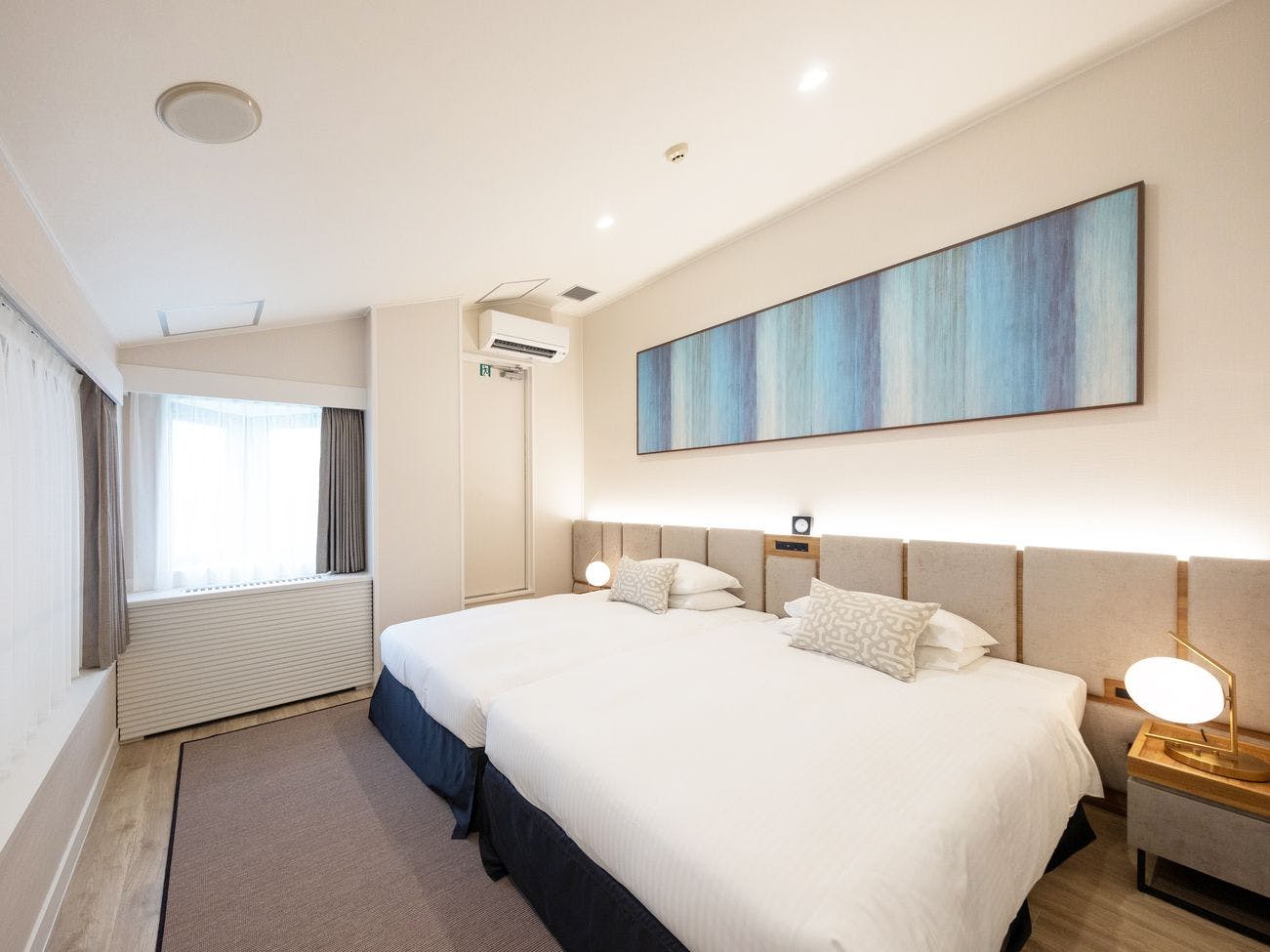 オクマの碧い海と白砂のビーチを表現した、ブルーとホワイトを基調とした明るく開放的な客室です。