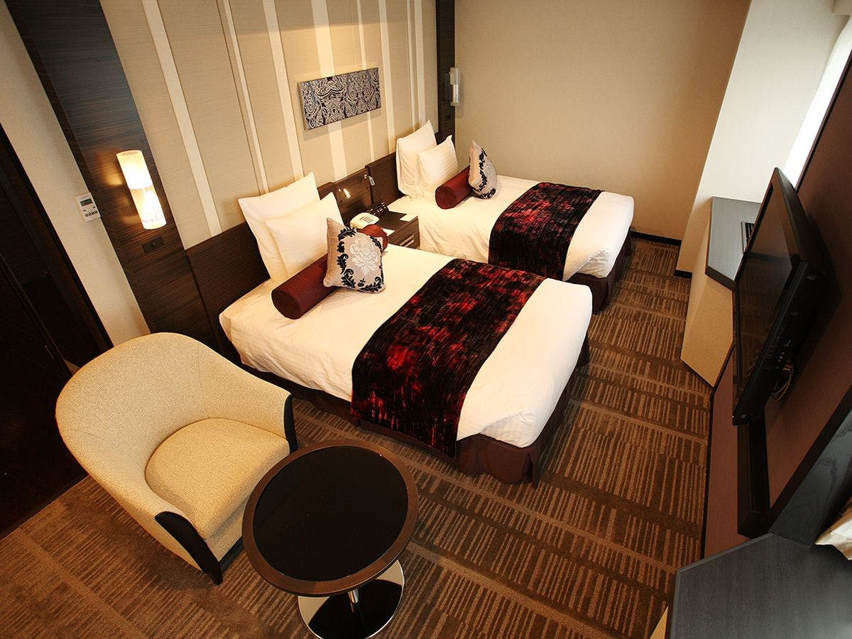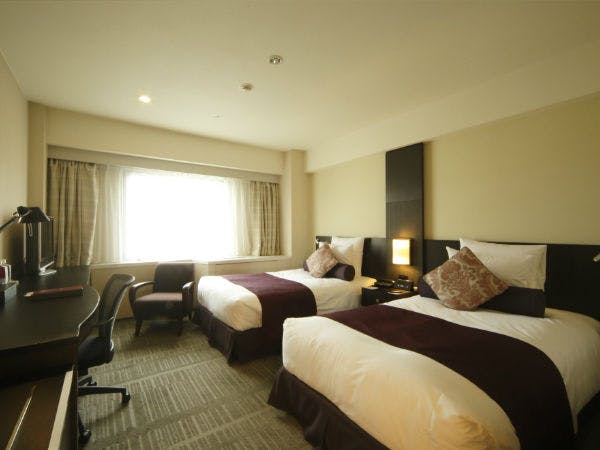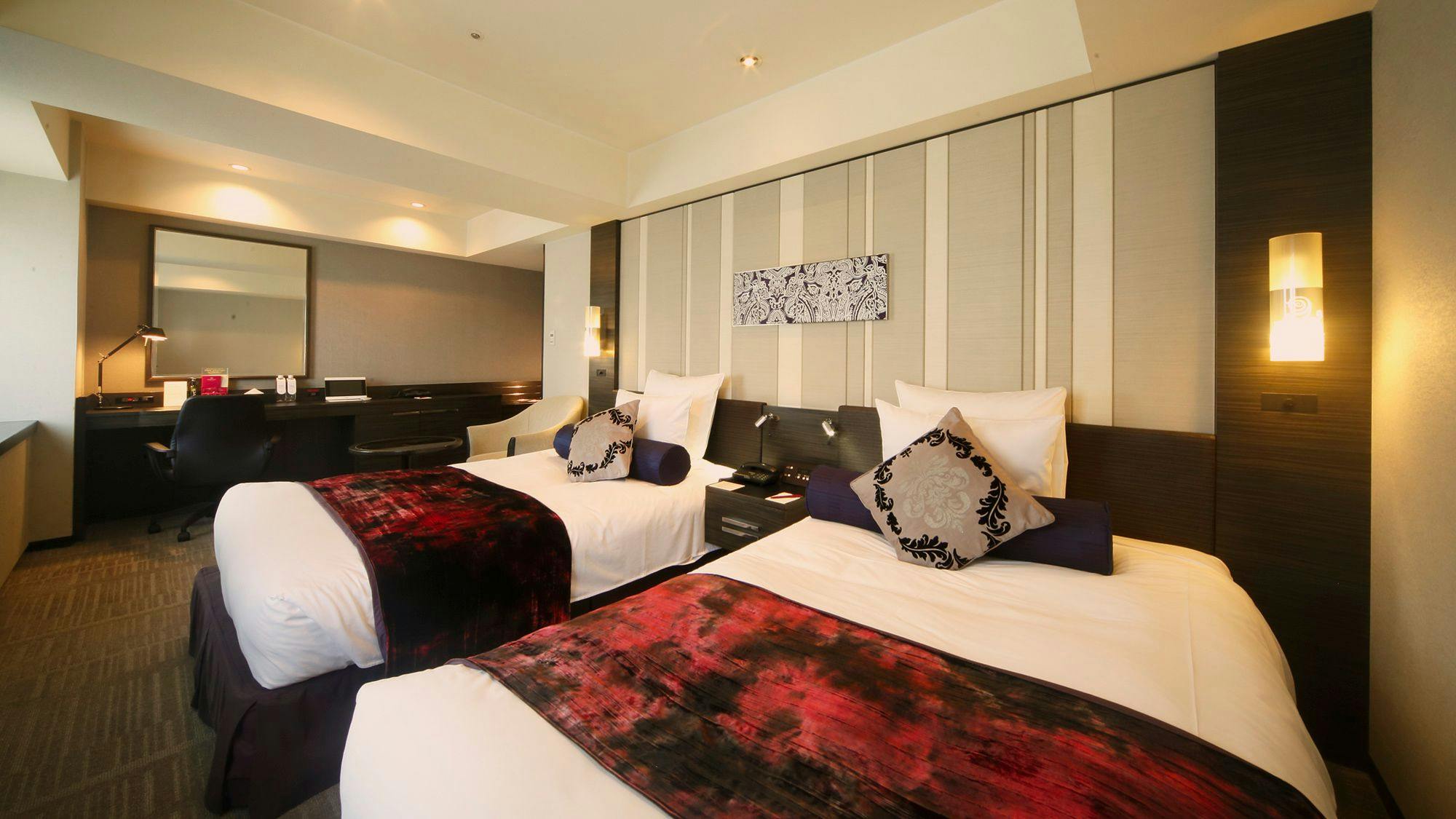 スタンダードなツインルーム。2名様に最適でシンプルな造りの中にも落ち着いた雰囲気のあるお部屋です。シモンズ社のベッドで快適な眠りをご堪能いただけます。※ユニットバス
