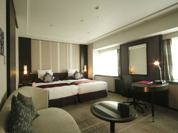 スタンダードなツインルーム。2名様に最適でシンプルな造りの中にも落ち着いた雰囲気のあるお部屋です。1名様のビジネス利用であれば充分なワーキングスペースが確保できます。シモンズ社のベッドで快適な眠りをご堪能いただけます。※ユニットバス