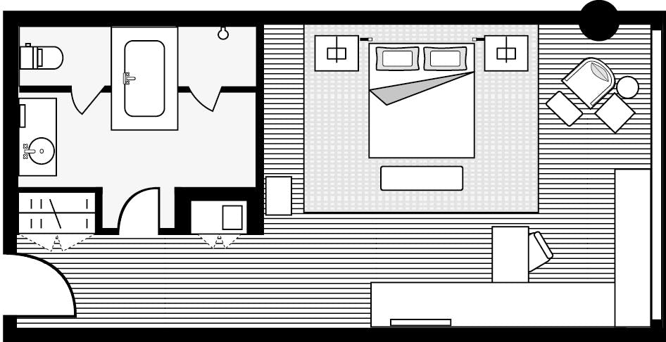 ワンベッドルームスイートはゆったりとした角部屋で、壁一面の大きな窓から自然光をふんだんに取り入れた開放的な設計です。リビングエリアには、ソファーベッド、コーヒーテーブル、エグゼクティブデスク、ゲスト用パウダールームを備えています。