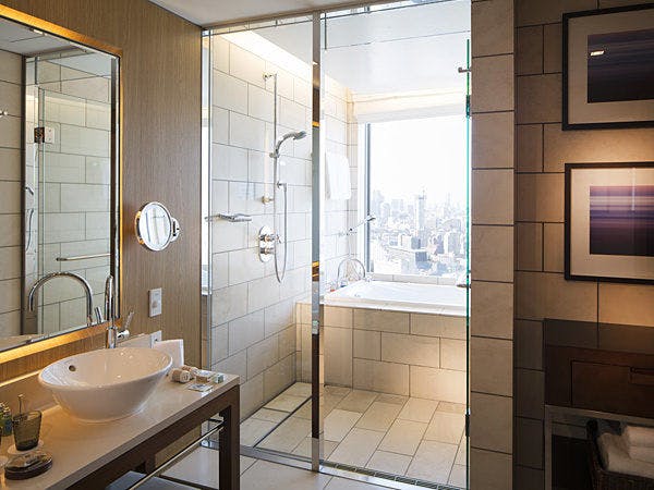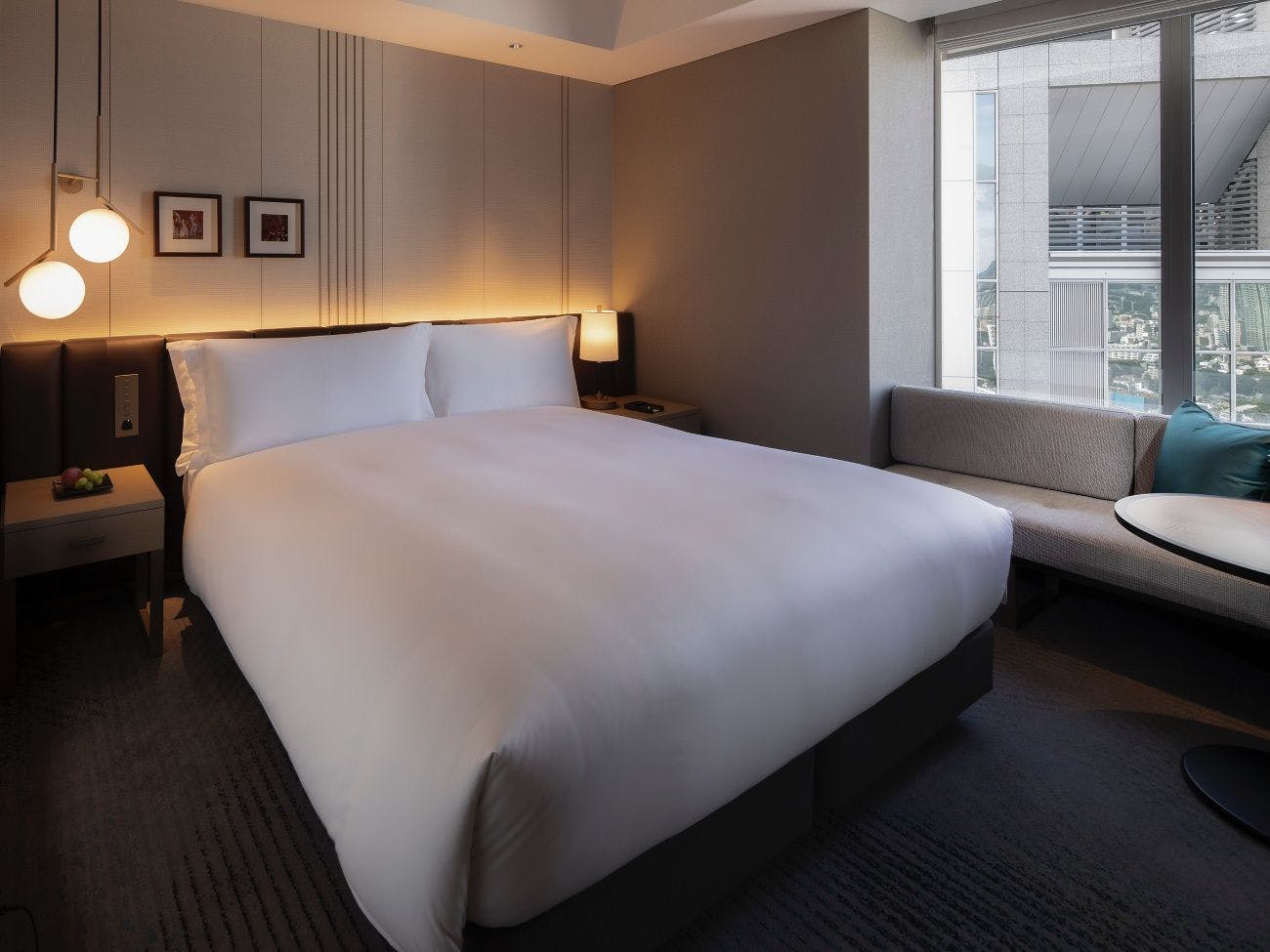 3mの天井高、窓から見渡す都会の眺望を堪能できる客室は、モダンでありながら、温かみを感じさせる空間を演出しています。ベッドはポケットコイル式の広々としたマットレスを使用。1日の疲れを癒してくれます。