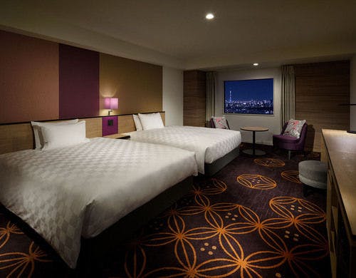 ビューバス付きのスタイリッシュなツインルーム。東京パノラマが満喫できるよう、インテリアの配置にもこだわりました。一部トリプルルームとしてもご利用いただけます。
