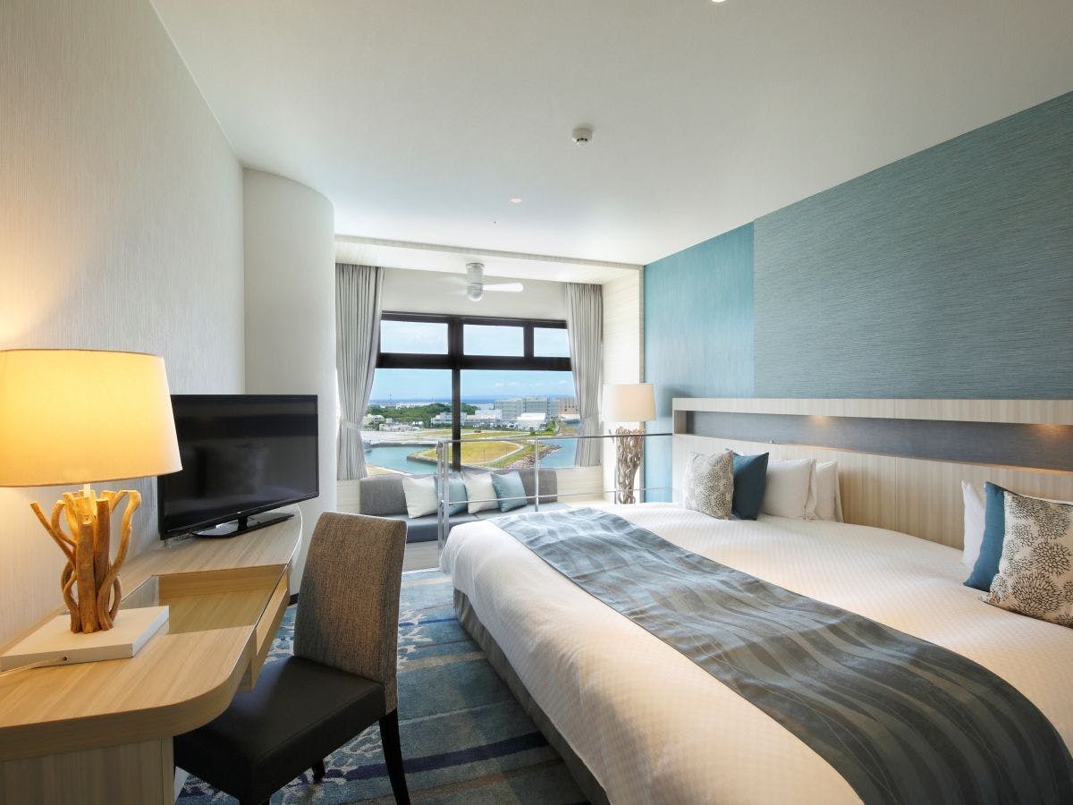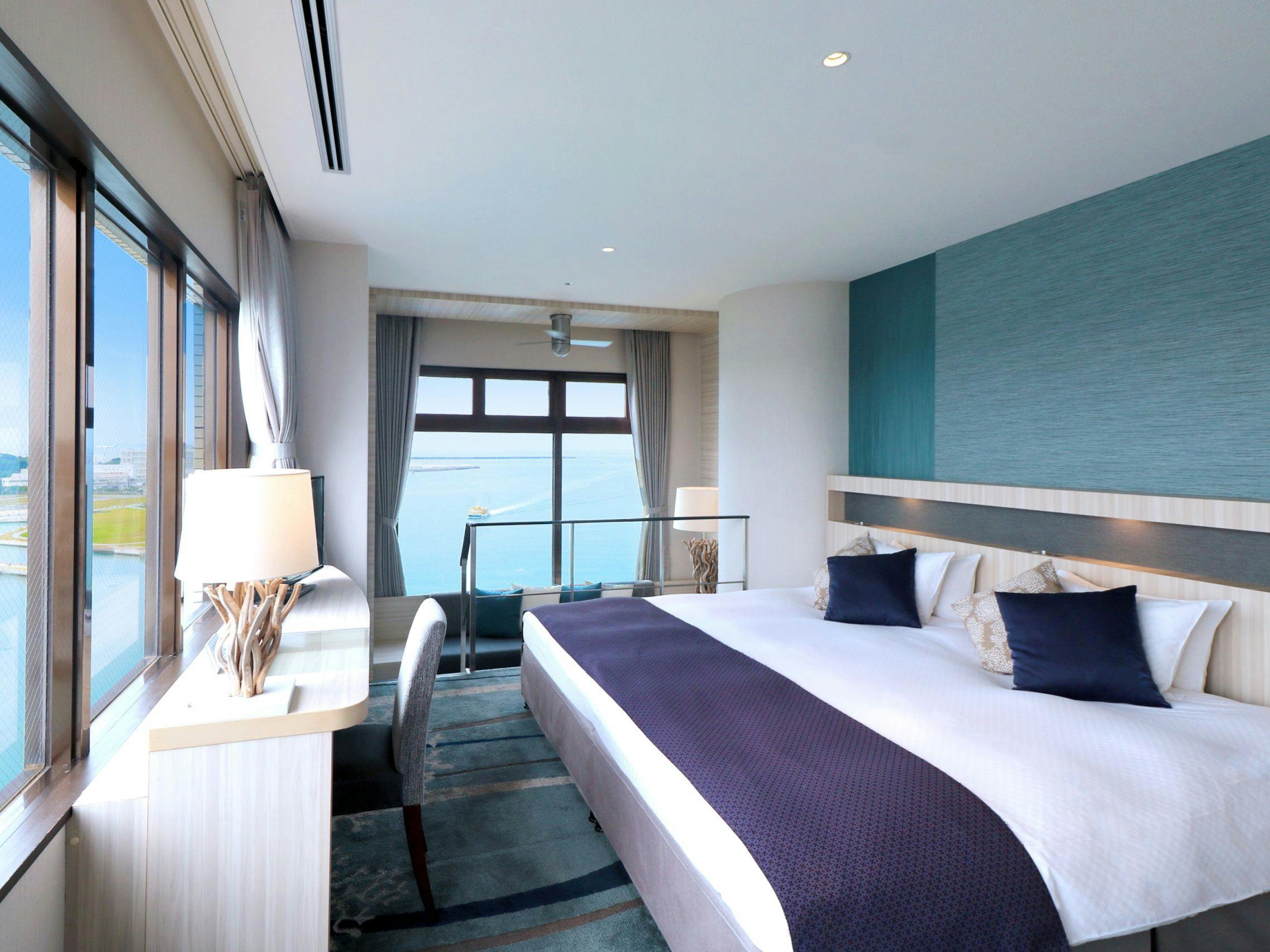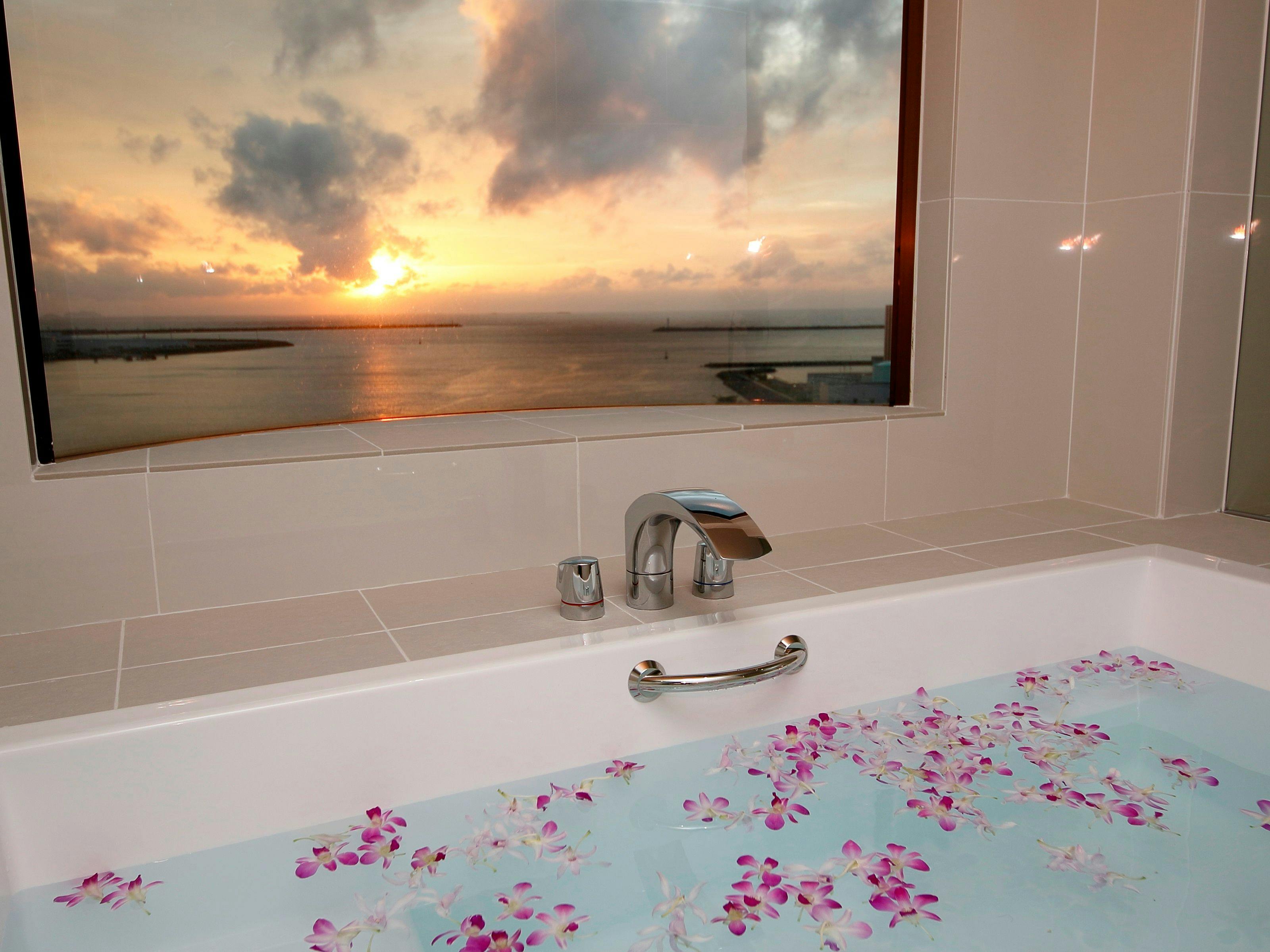 【 眺 望 】 バスタブから那覇港を望むビューバスタイプのバスルームをご用意した贅沢な空間に240cm幅のキングベットでゆったりとお過ごし頂けます。