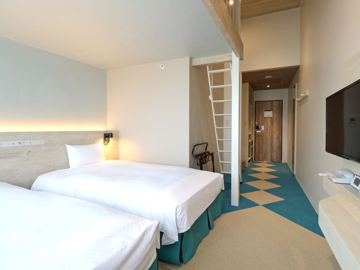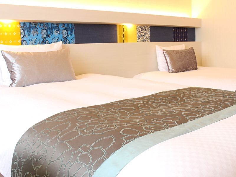 沖縄のビーチをイメージしたデザインのツインルーム。