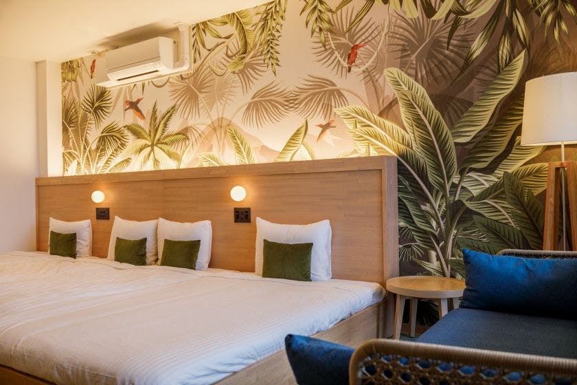 宮古島の自然、花、海をイメージした「シングルベッド2台、2段ベッドx1台」のお部屋をご用意いたします。