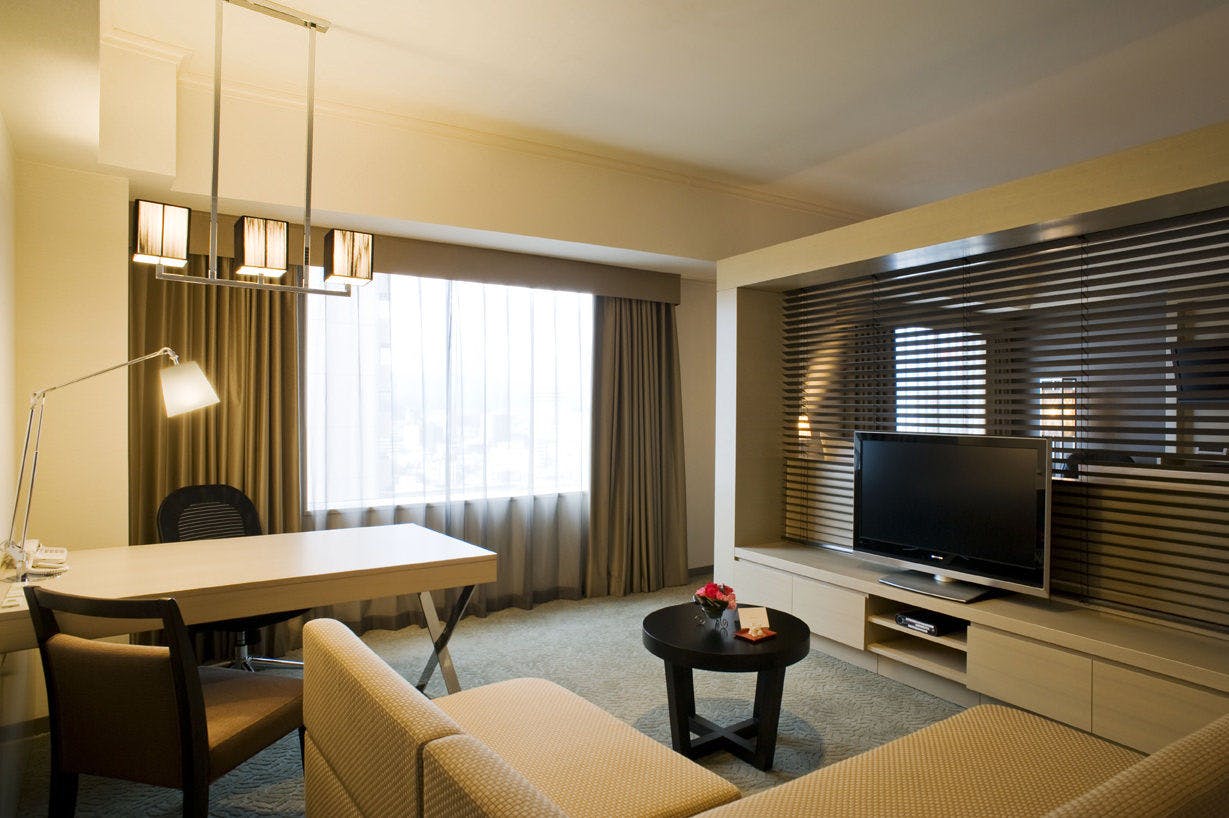 高層階プレミアムフロアの18FLに位置するロイヤルスイートルーム。エレガントなインテリアの室内はリビングと寝室が分かれており、上質なくつろぎの時間を演出いたします。
