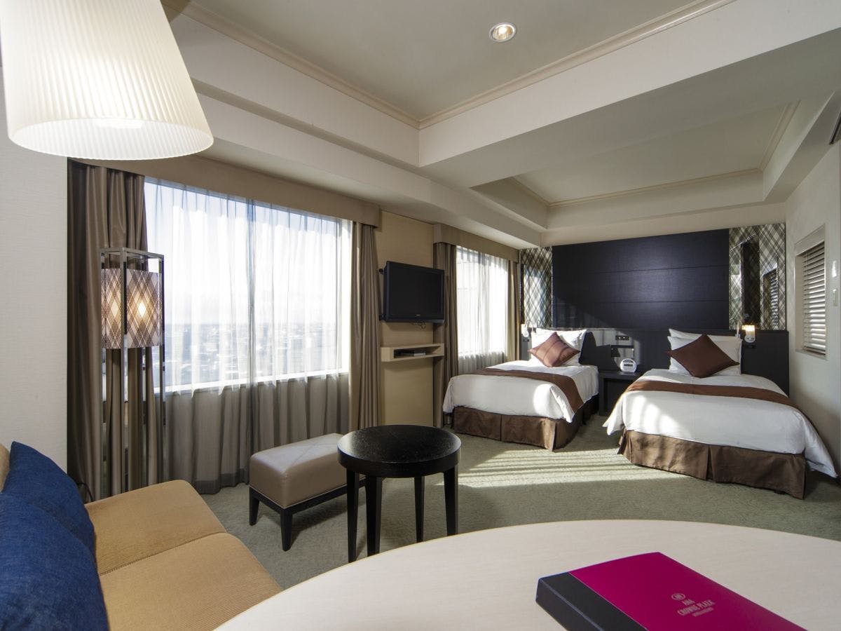 スタンダードフロアのデラックススコーナーツインルーム。洗練された、モダンで上質な空間でゆったりとした癒しのひとときを。広さは、42.7平米。ANAクラウンプラザホテル金沢ならではの快適なホテルステイをお楽しみください。※3~4名様ご利用の場合は、レギュラーベッド2台にエキストラベッド または トランドルベッドをご用意いたします。※客室内の家具やレイアウトは異なる場合がございます。
