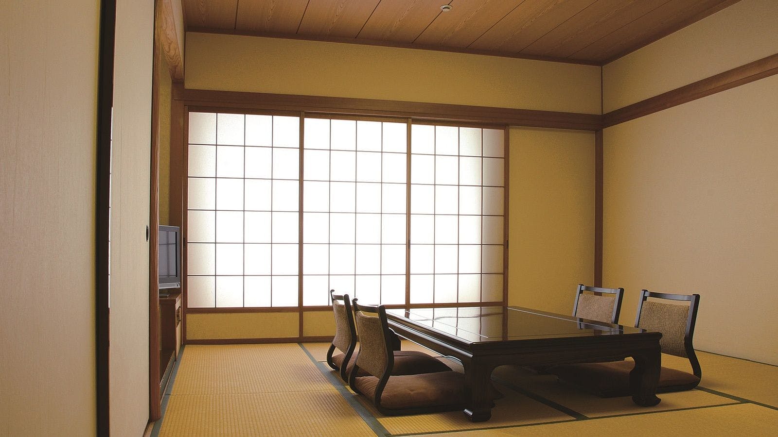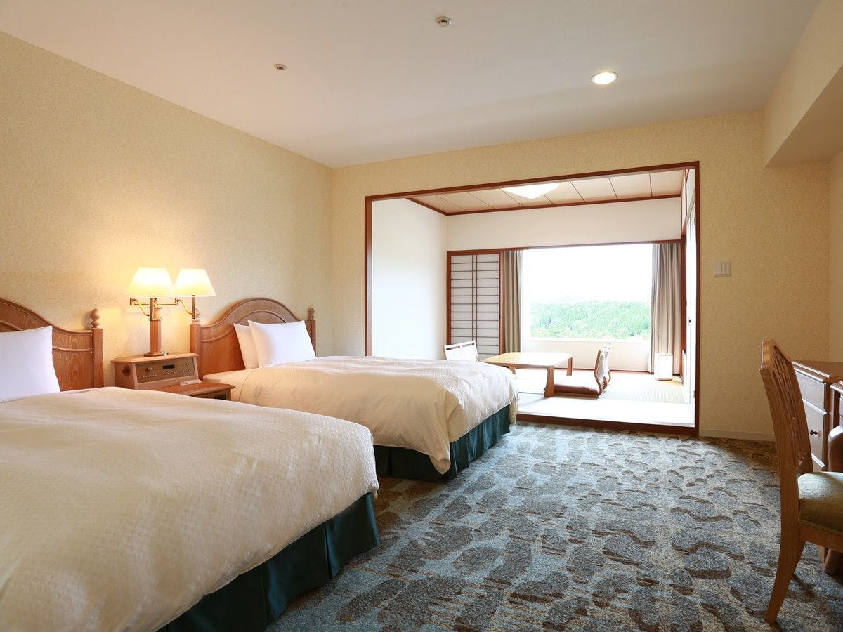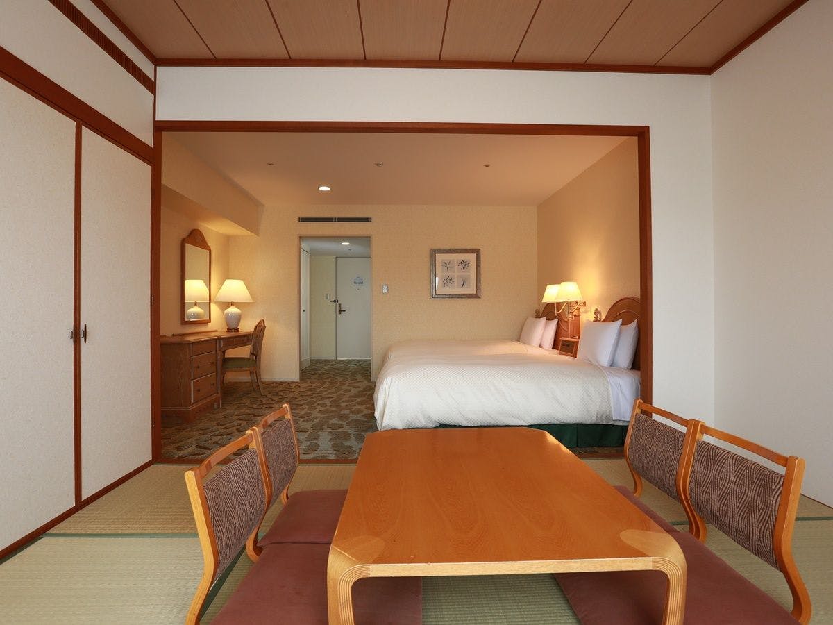 46平米のゆとりのスペースに幅120cmのセミダブルベッド2台と利用人数に応じてお布団を最大2組まで可能な部屋。※寝具の数について(添い寝人数は除く)※2名利用時:ベッド2台3名利用時:ベッド2台、布団1組4名利用時:ベッド2台、布団2組和室・洋室それぞれの良さを生かしながらも、どちらにも偏らない落ちついたインテリア。ナチュラル色の家具がさりげない空間です。全客室、無線LANによるインターネット接続無料。パソコンはお部屋に設置されておりません。定員:標準 4名
