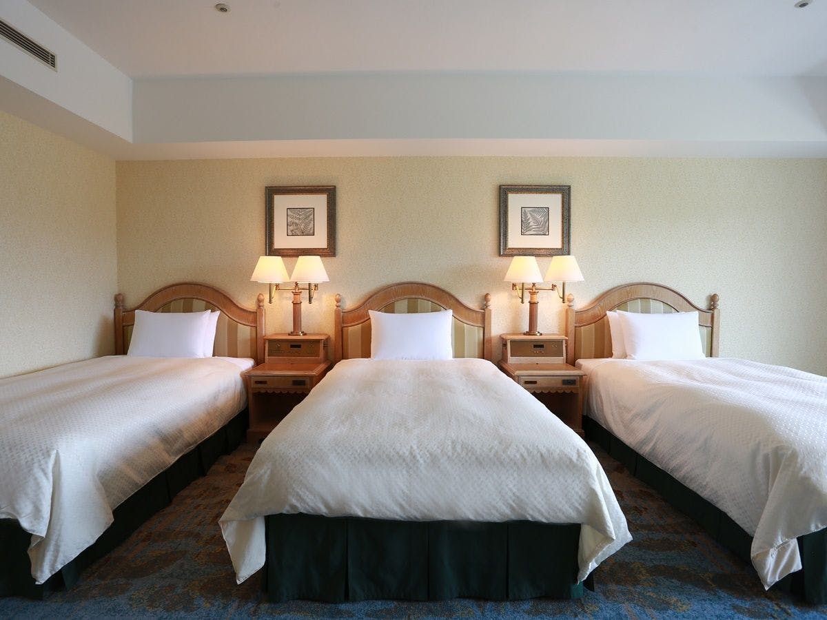 46平米のゆとりのスペースに幅110cmのベッドを3台ご用意。客室内に冷凍冷蔵庫、電子レンジ設置。定員:標準 3名※エキストラベッド追加で最大4名利用可