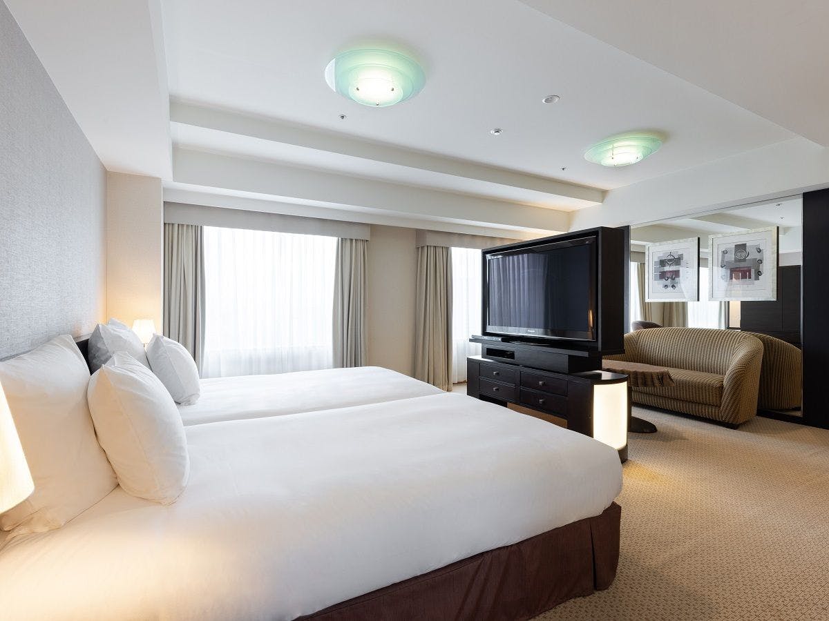 40平米の広さが人気のエグゼクティブツインルーム。大型テレビとゆったり寛げるソファを設置し、シンプルながらも高級感のある客室です。