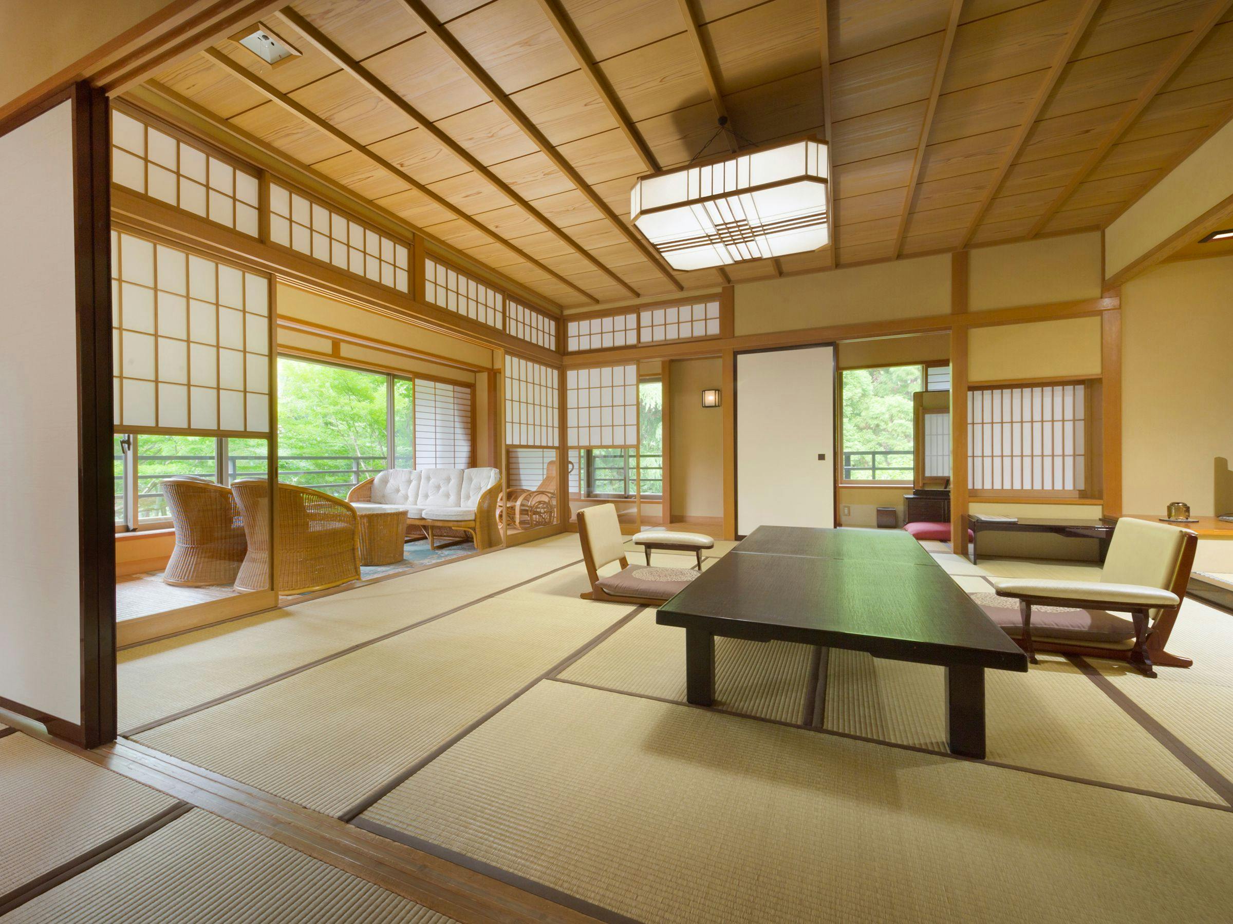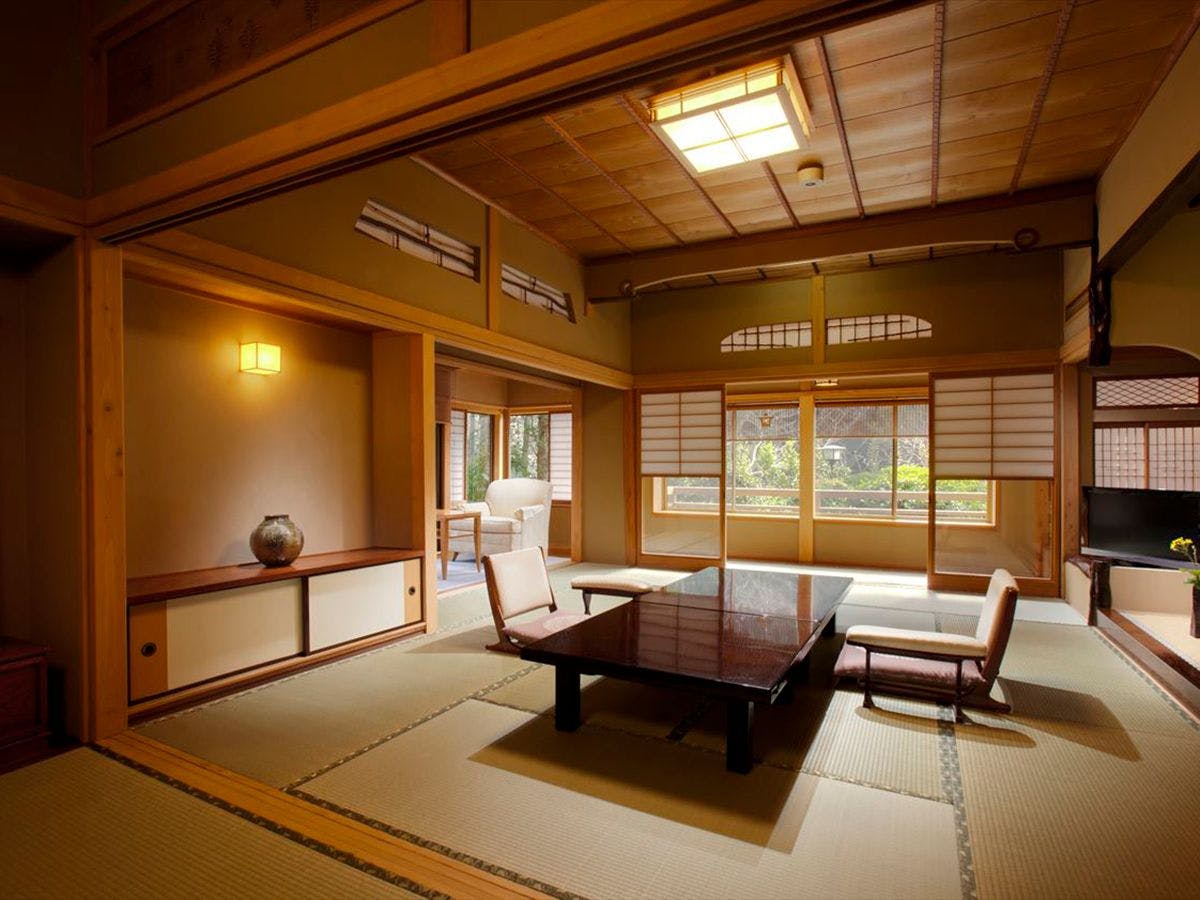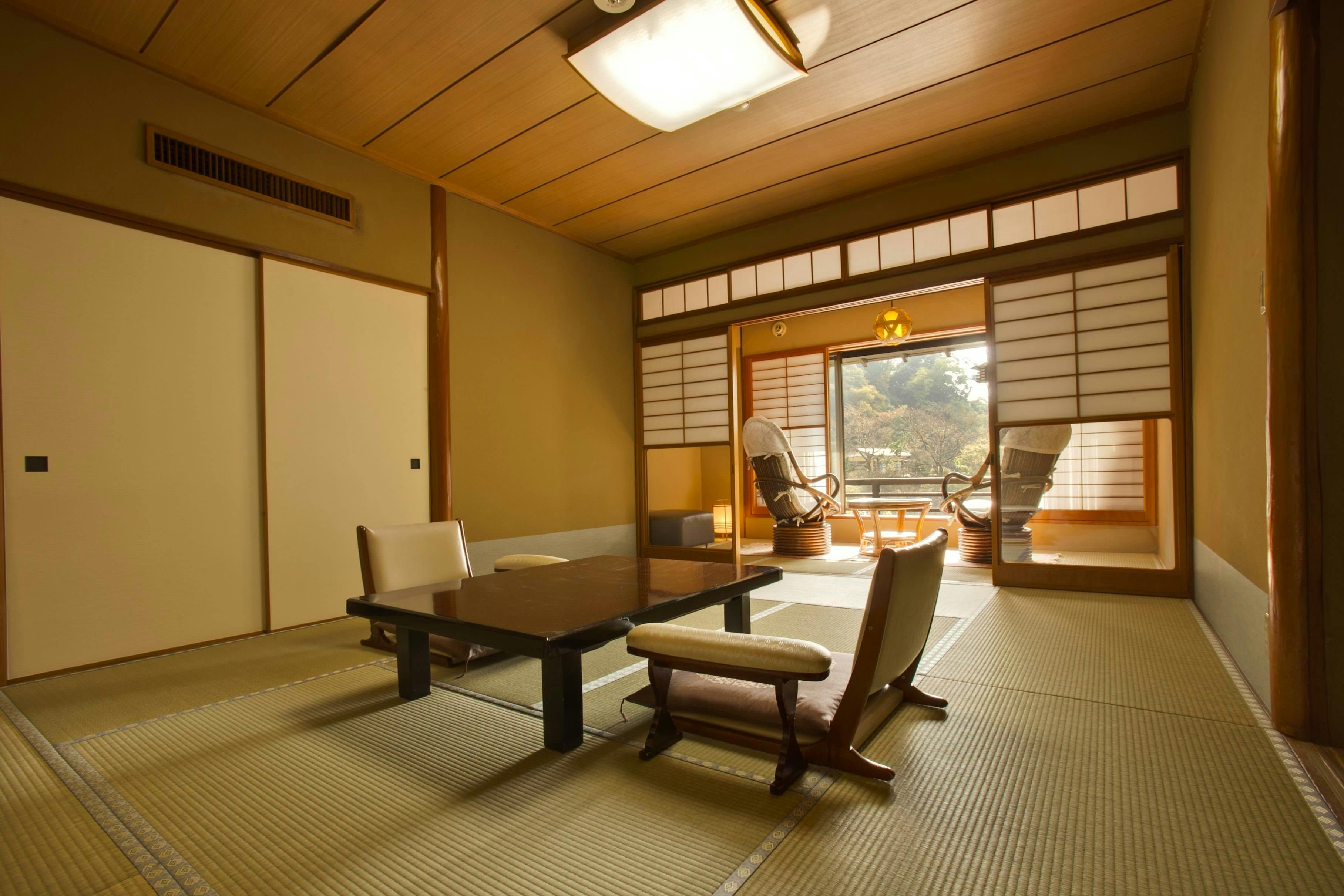 緑に囲まれた静かな落ち着いた数奇風造りの和室。天城の清流のせせらぎと心地よい風に癒されます。