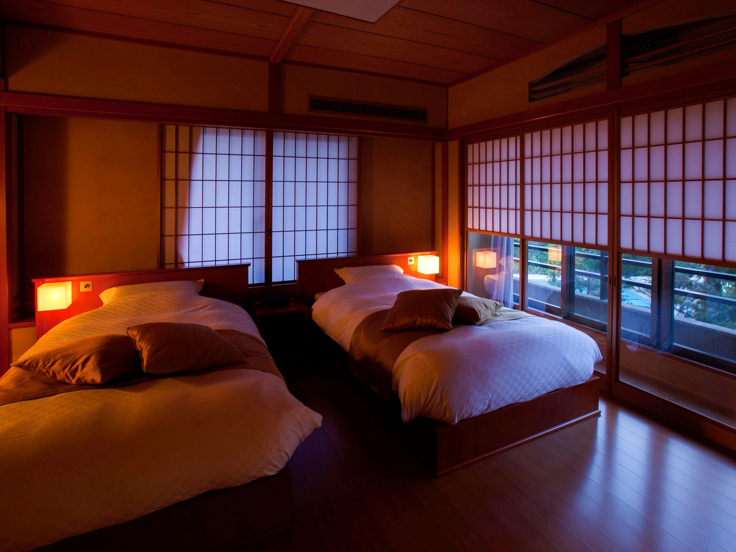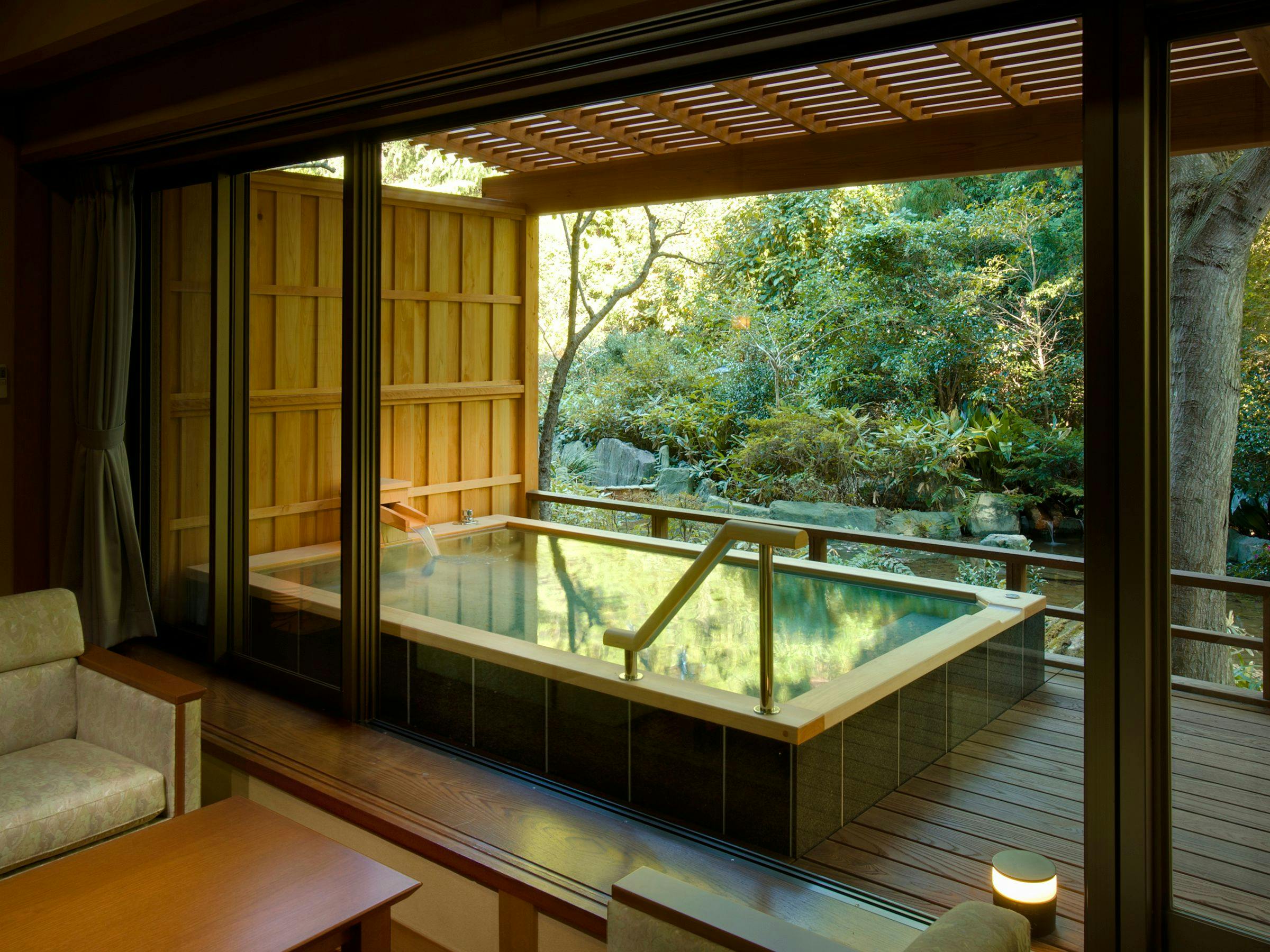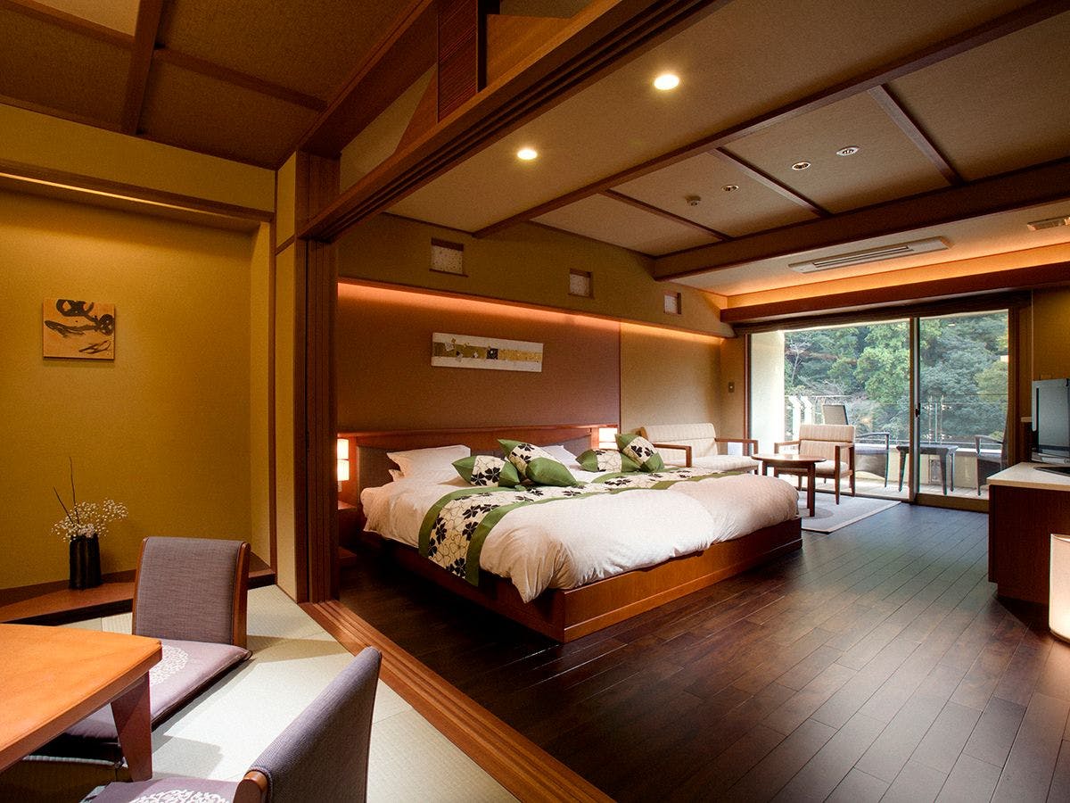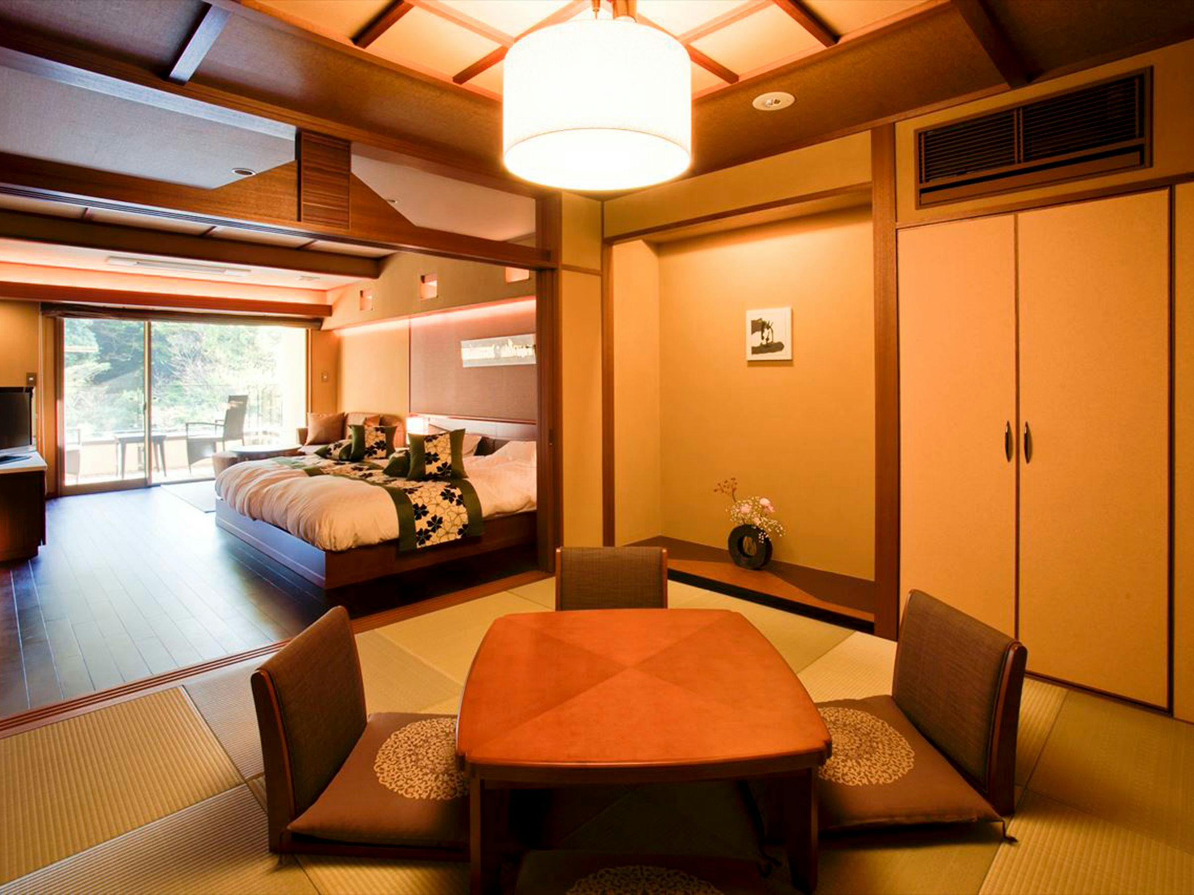 和の寛ぎとゆったりとした睡眠でリラックスいただけますようツインベットの半露天風呂付和洋室になります。デッキテラスでプライベートな森林浴を楽しんだり、24時間掛け流しの露天風呂を存分にお楽しみ下さい。