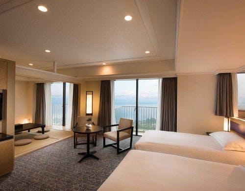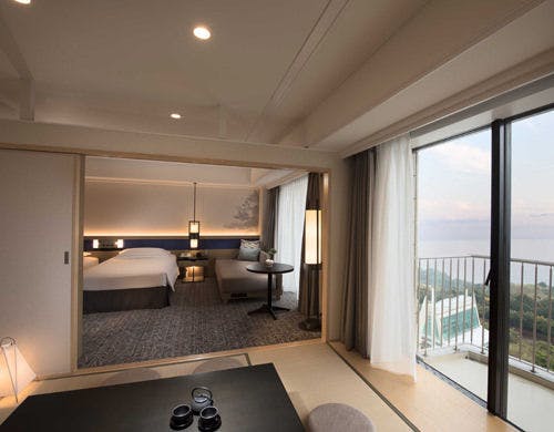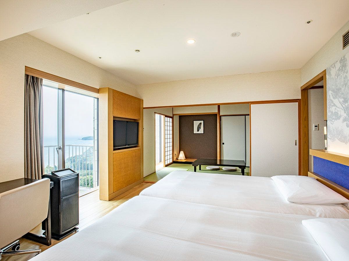 7~11階に位置し、59平米とゆったりとお過ごしいただける和洋スイートは洋室と和室でも段差が少なく靴を脱いでくつろげる角部屋で、バルコニーからは溢れる緑と、相模湾が一望でき、さらには小田原城のある小田原市街も眺めていただける数少ないお部屋です。最大5名様までご利用いただけます。