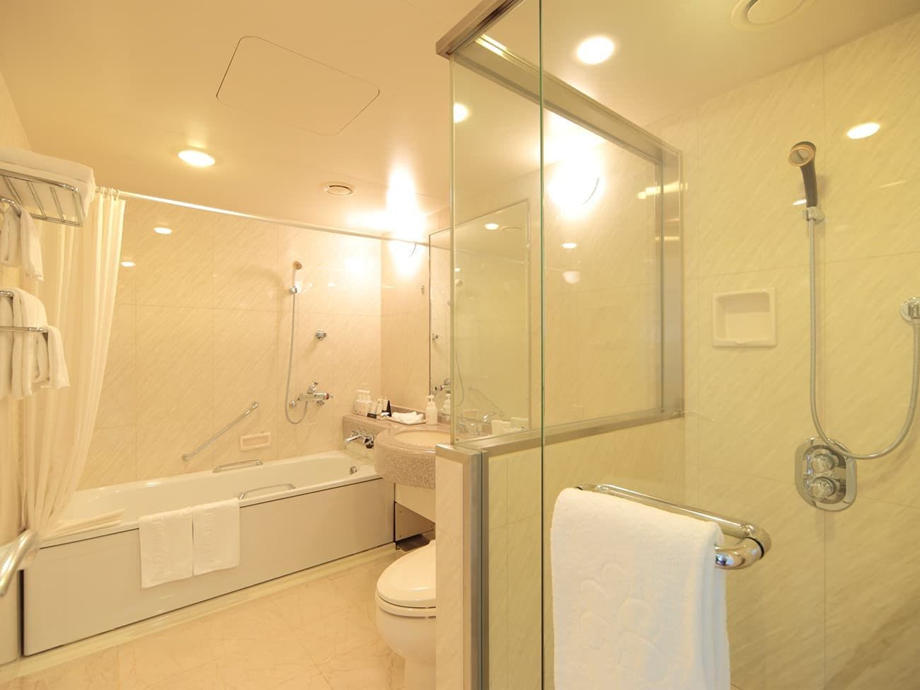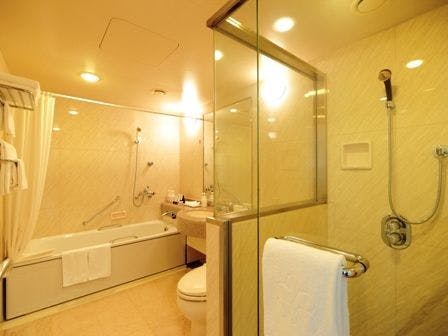 ●バスルームにはシャワーブース付き。ミキモトコスメティックスのバスアメニティで、癒しのバスタイムを